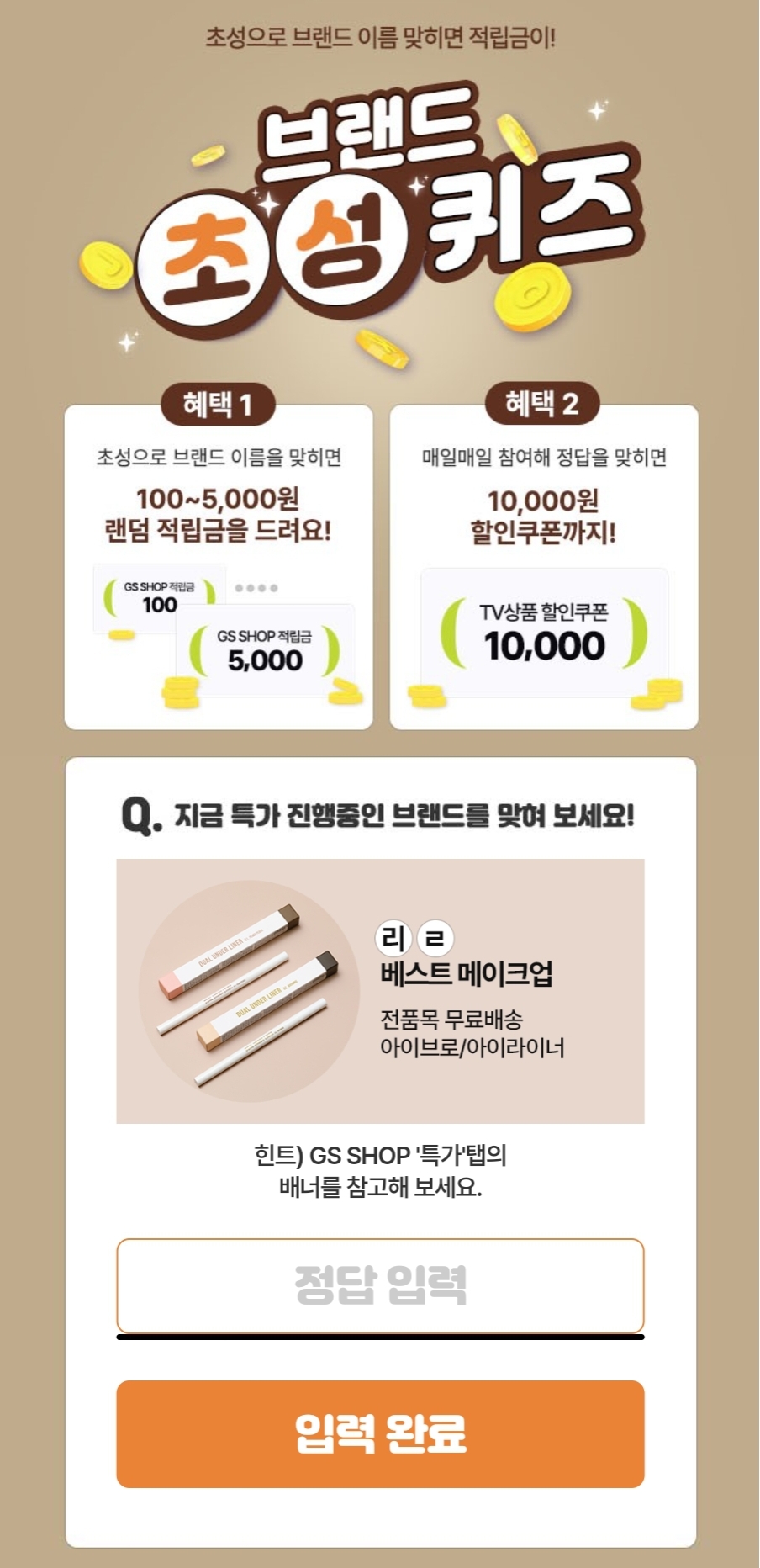 카테고리 없음 [GS SHOP] 초성퀴즈 맞추고 최대 5000원 포인트 받으세요 by 노랑킹콩 2023. 9. 23. 로그인 ⭕정답 : 리르 https://event.gsshop.com/event/initial-quiz GS SHOP 브랜드 초성 퀴즈브랜드 초성퀴즈 맞히고 적립금 받아가세요!event.gsshop.com️ 공유하기 게시글 관리 노랑킹콩의 여행 댓글