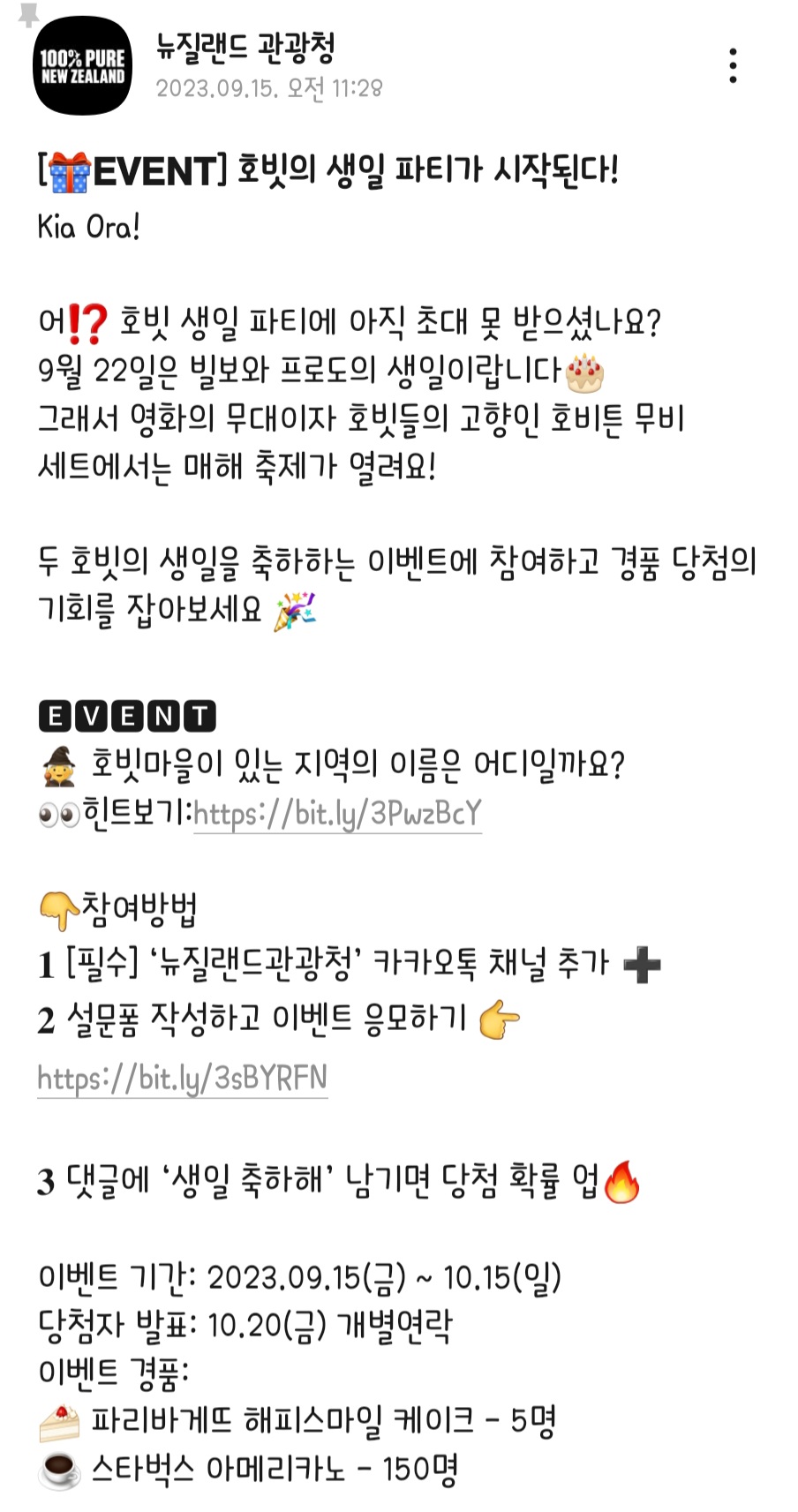 카테고리 없음 [뉴질랜드 관광청] 카톡채널 추가하고 설문 폼 작성해서 케이크 받으세요 (~10.15) by 노랑킹콩 2023. 9. 26. 로그인 ⭕️ 정답 : 와이카토 http://pf.kakao.com/_qFNHb/101897414 [🎁𝗘𝗩𝗘𝗡𝗧] 호빗의 생일 파티가 시작된다!Kia Ora! 어⁉️ 호빗 생일 파티에 아직 초대 못 받으셨나요? 9월 22일은 빌보와 프로도의 생일이랍니다🎂 그래서 영화의 무대이자 호빗들의 고향인 호비튼 무비 세트에서는 매해 축제가 열려요! pf.kakao.com 공유하기 게시글 관리 노랑킹콩의 여행 댓글