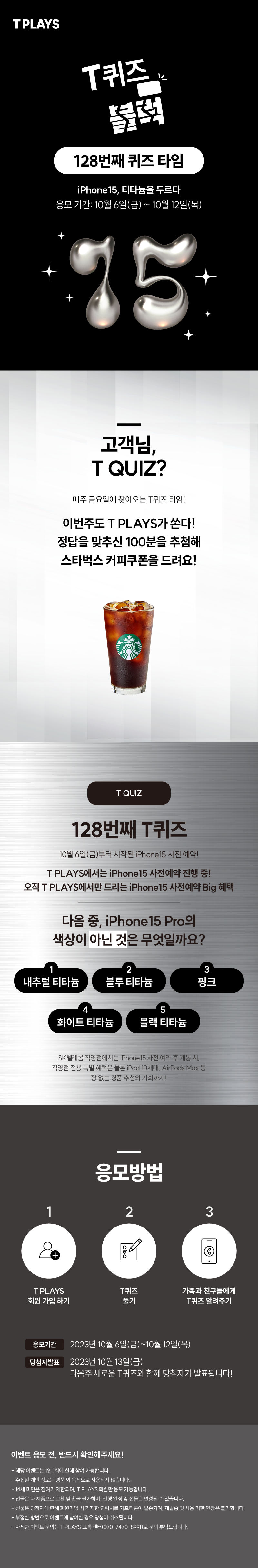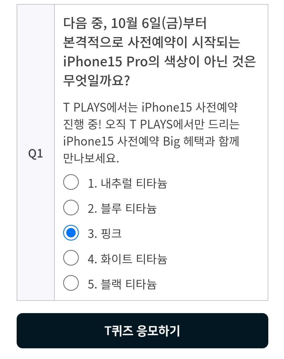 카테고리 없음 [T PLAYS] 퀴즈풀고 추첨 100명 스벅 받으세요 (~10.12) by 노랑킹콩 2023. 10. 6. 로그인 ⭕️정답 : 핑크 https://www.t-plays.com/event/detail.do?sno=343 T PLAYS일상의 행운을 선물하는 믿을 수 있는 SK텔레콤 직영점www.t-plays.com:443 공유하기 게시글 관리 노랑킹콩의 여행 댓글