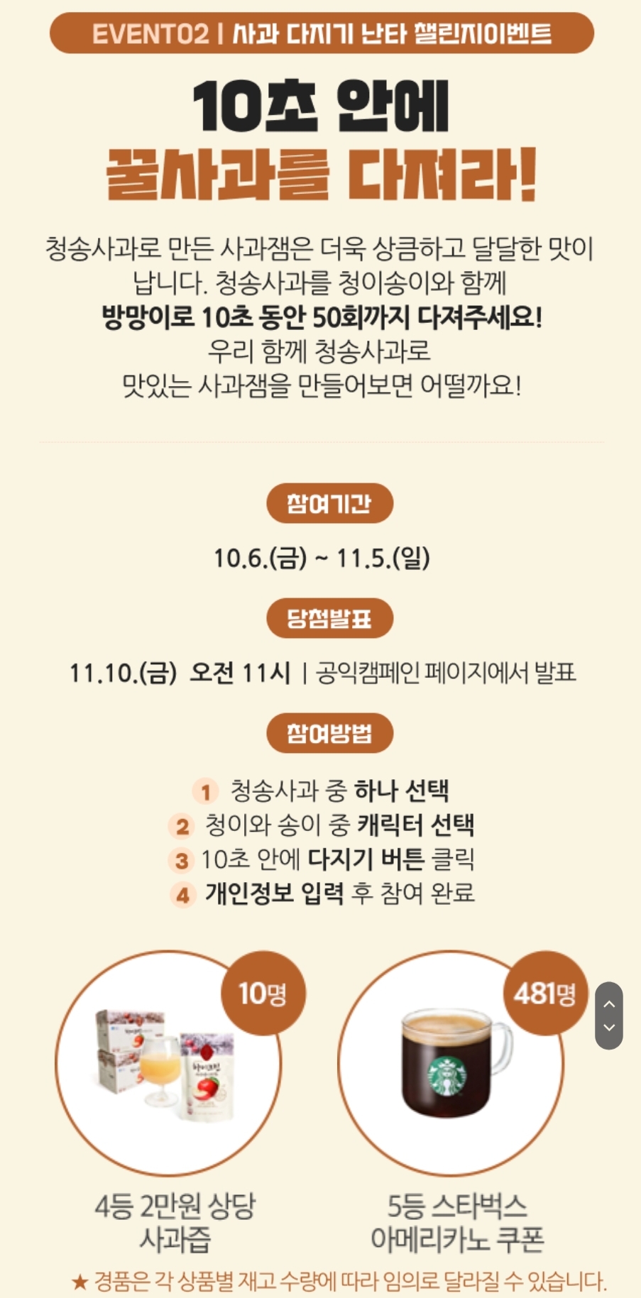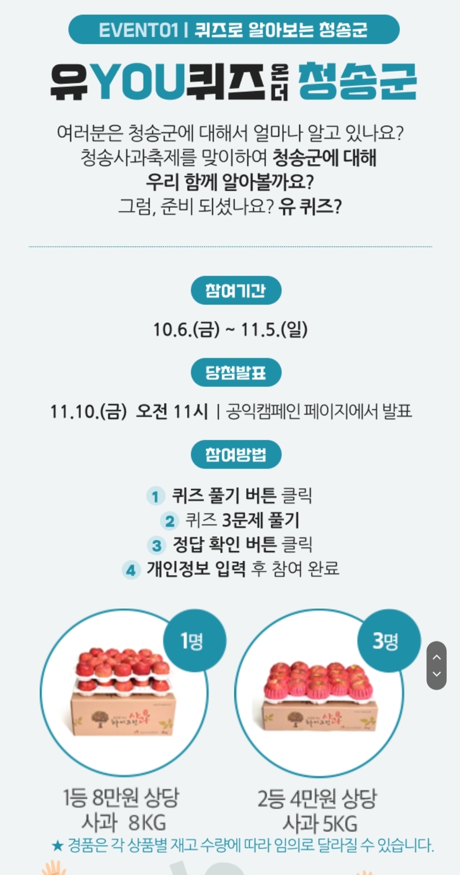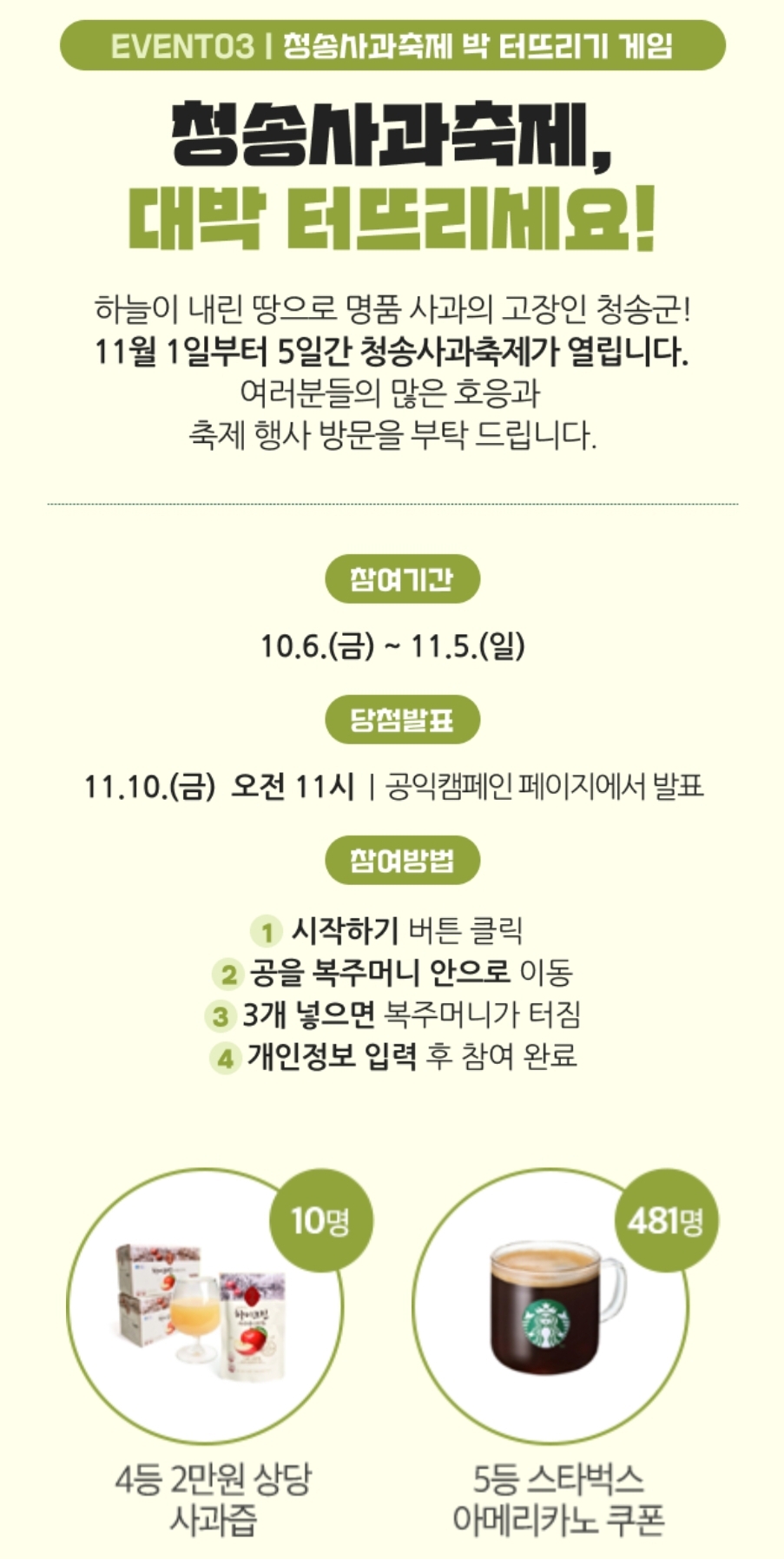 카테고리 없음 [청송사과축제] 퀴즈풀고 스벅 받으세요 (481명 추첨) (~11.05) by 노랑킹콩 2023. 10. 9. 로그인 ❌️정답 : 청송사과 / 달기약수터 / 주왕산 https://promotion.daum-kg.net/2023csfestival/m/index.html 다음과 산소카페 청송군이 함께하는 「제17회 청송사과축제(11.1~11.5)」공익캠페인 promotion.daum-kg.net 공유하기 게시글 관리 노랑킹콩의 여행 댓글