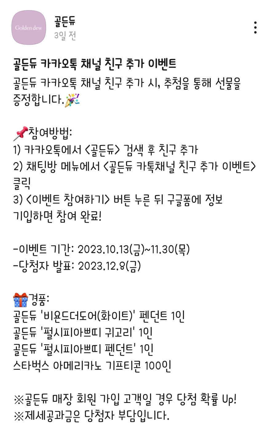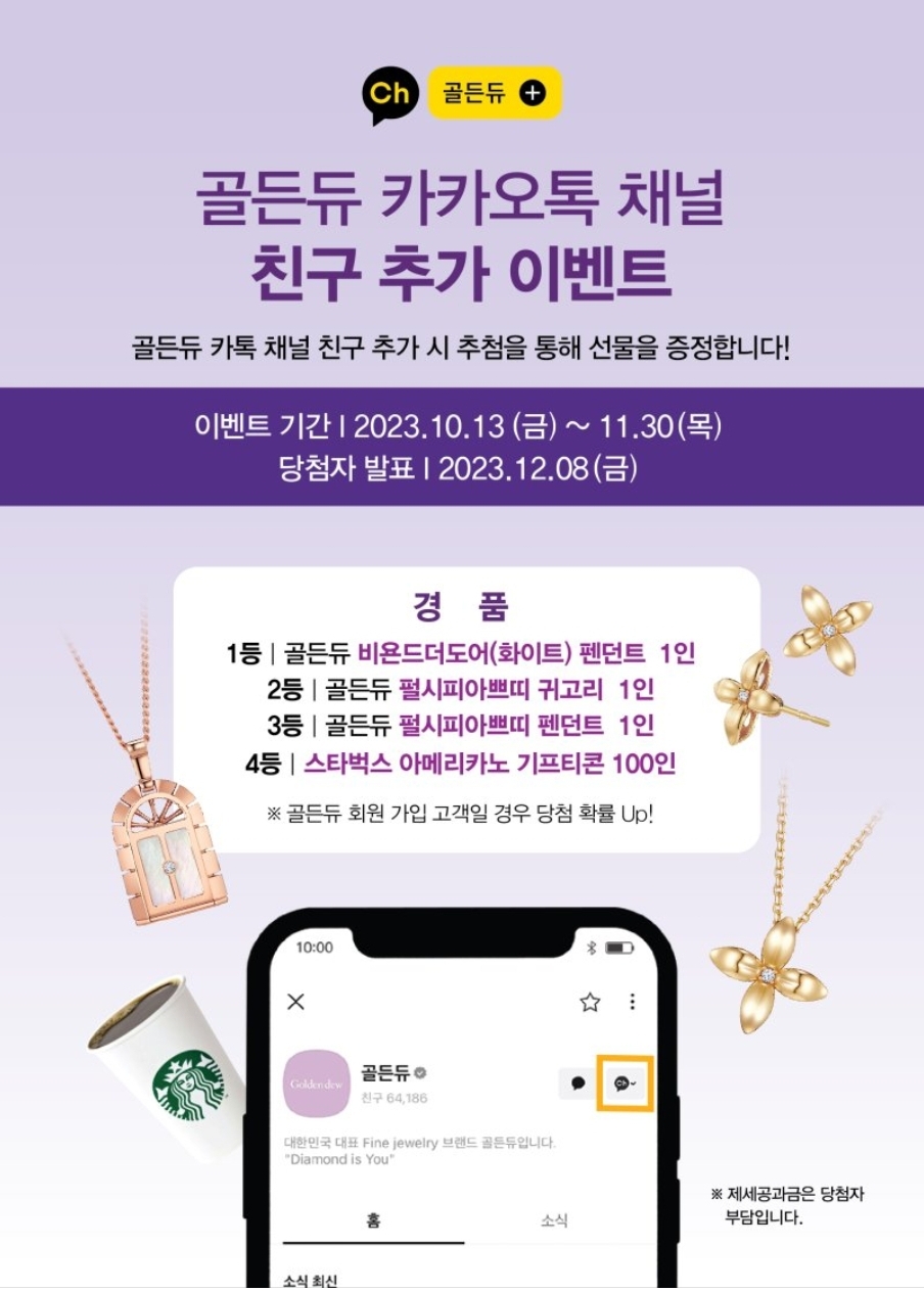 카테고리 없음 [카카오톡] 골든듀 카톡 채널 친추 이벤트 (~11. 30) by 노랑킹콩 2023. 10. 16. 로그인 ⭕️검색으로 골든듀 카톡 채널 친구하고 폼 작성까지 해야 완료예요^^ http://pf.kakao.com/_Ppnxhd 골든듀대한민국 대표 Fine jewelry 브랜드 골든듀입니다. "Diamond is You"pf.kakao.com 공유하기 게시글 관리 노랑킹콩의 여행 댓글