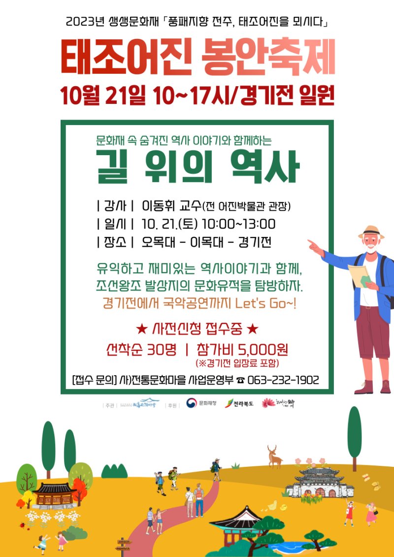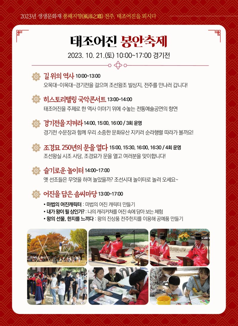 이번 축제는 문화재 속 숨겨진 역사이야기와 함께하는 <길 위의 역사>를 시작으로, 경기전 탐방 체험 <경기전을 지켜라>, 축제날에만 한시적으로 개방되는 <조경묘