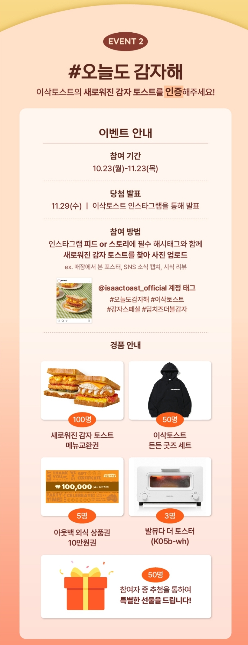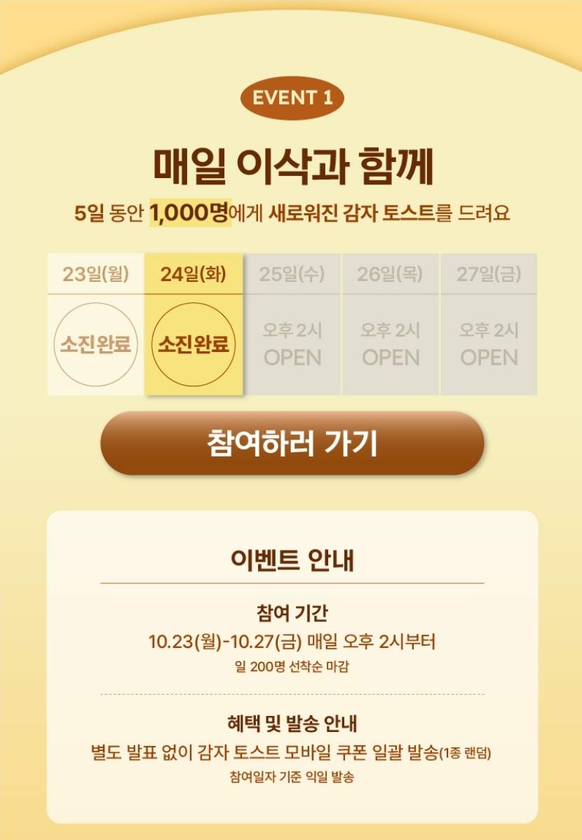 카테고리 없음 [이삭토스트] 매일 선착순 200명에게 감자토스트를 주네요 (~10.27) by 노랑킹콩 2023. 10. 24. 로그인 ❌️오후 2시에 매일 200명 선착순 https://www.isaac-toast.co.kr/community/event.php?ptype=view&idx=1212&page=&code=event 이삭토스트www.isaac-toast.co.kr 공유하기 게시글 관리 노랑킹콩의 여행 댓글