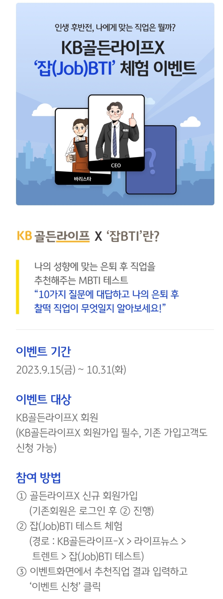 카테고리 없음 [KB골든라이프] 은퇴후 직업 찾기 체험하면 cu 편상 3천원 1000명 추첨 (~10.31) by 노랑킹콩 2023. 10. 26. 로그인 ⭕️ https://www.kbgoldenlifex.com/senior/XAA72M07020.kb?bltsDstcd=06&evntSerno=2091 [KB골든라이프X]은퇴 후 직업찾기 테스트 '잡(Job)BTI' 참여 이벤트 www.kbgoldenlifex.com 공유하기 게시글 관리 노랑킹콩의 여행 댓글