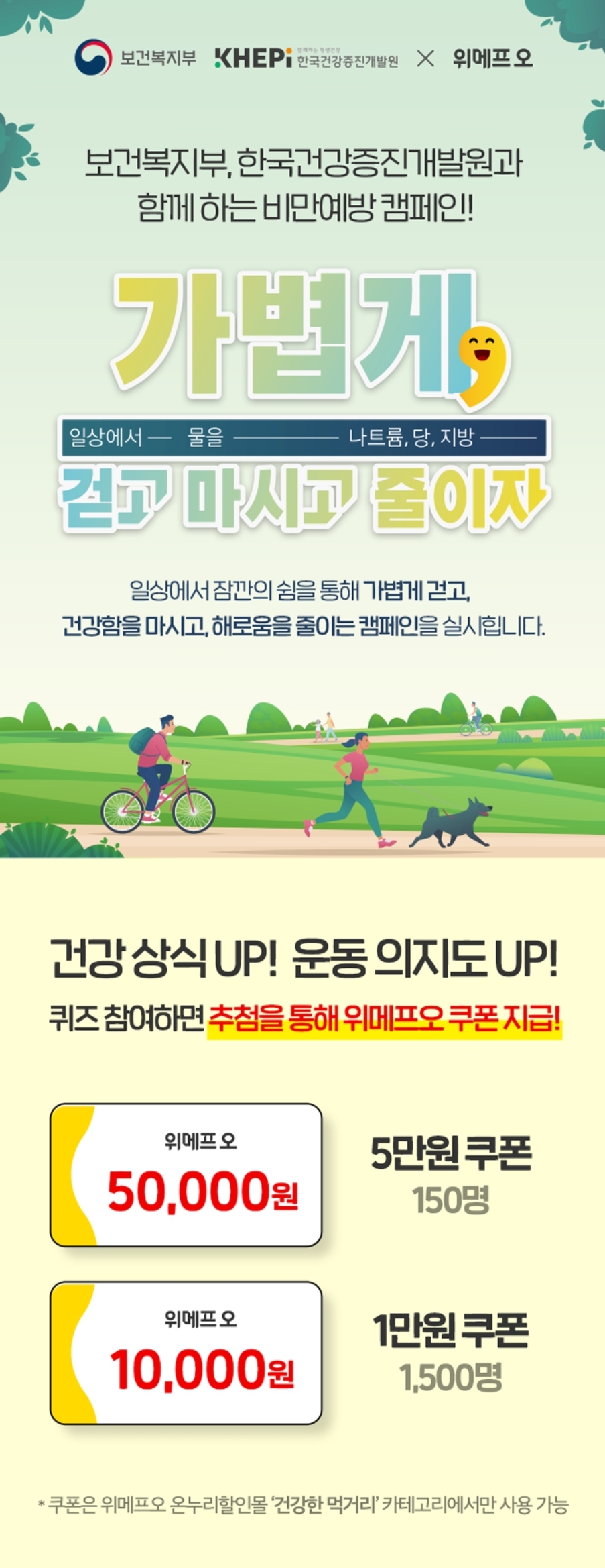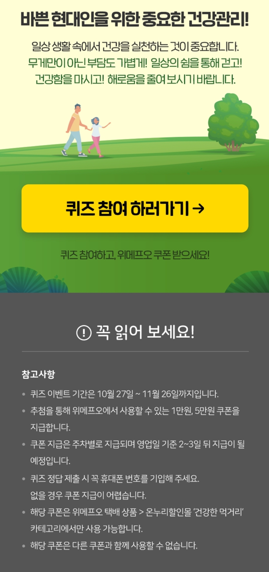 카테고리 없음 [위메프오] 퀴즈풀고 (5만원 150명/ 만원 1500명 추첨) 쿠폰 받으세요 (~11.26) by 노랑킹콩 2023. 10. 27. 로그인 ⭕️정답 : X X O https://www.wmpo.co.kr/events/2594617 비만예방캠페인_프로모션위메프오 앱에서 확인하세요.www.wmpo.co.kr 공유하기 게시글 관리 노랑킹콩의 여행 댓글