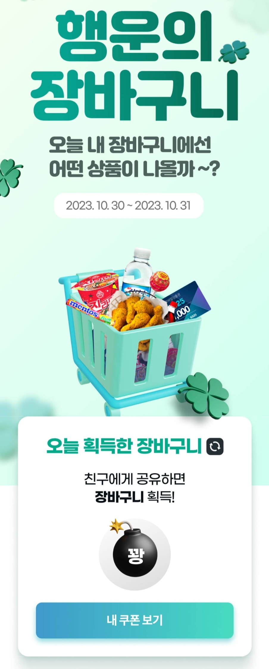카테고리 없음 [하나머니] 공유하고 장바구니 열어 치킨 당첨 되세요 (~10.31) by 노랑킹콩 2023. 10. 30. 로그인 ⭕️ http://m.hanamembership.com/fvr/f6200/fVRF62006202m.do?CTS_ID=MCPN202310213195[하나머니] 랜덤 선물 받아가세요~♪하나머니 앱에서 참여하기m.hanamembership.com 공유하기 게시글 관리 노랑킹콩의 여행 댓글