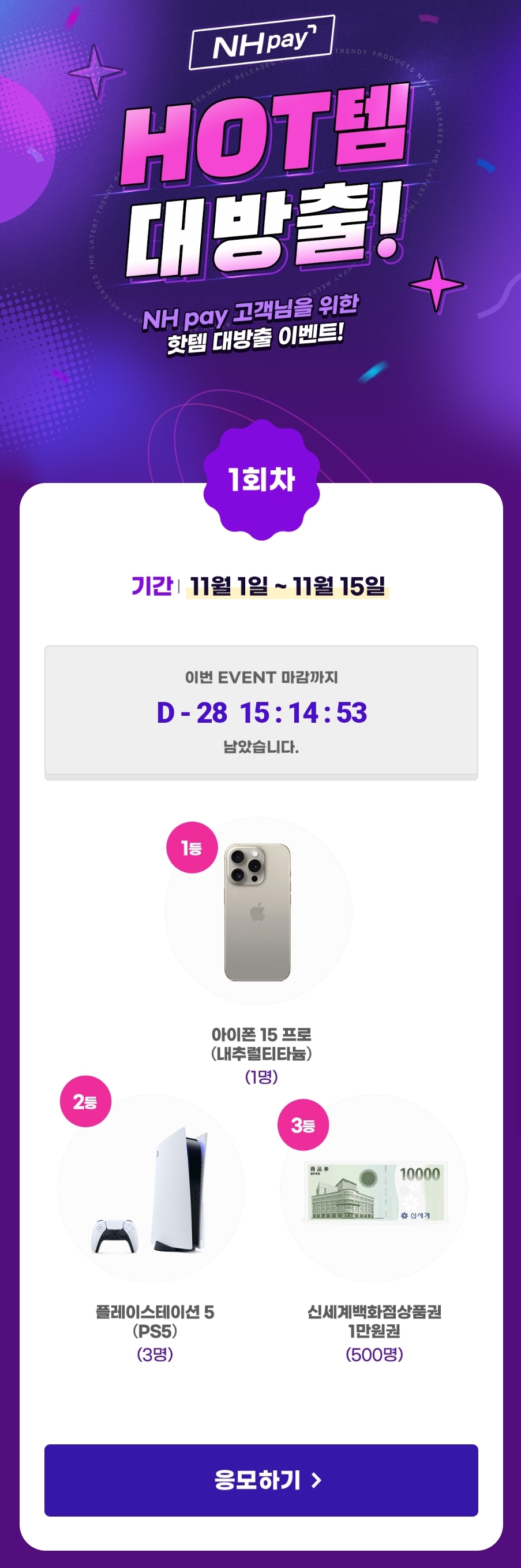 카테고리 없음 [NH pay] 응모하기 누르고 아이폰 15프로, 신세계 상품권 당첨되세요 (~11.15) by 노랑킹콩 2023. 11. 2. 로그인 ⭕️nh pay 앱 > 혜택 https://play.google.com/store/apps/details?id=nh.smart.nhallonepay NH pay(NH페이) - Google Play 앱모든 생활에 깊이, 페이다 ‘NH pay’ 더 새로워진 NH pay를 지금 바로 경험해보세요.play.google.com 공유하기 게시글 관리 노랑킹콩의 여행 댓글