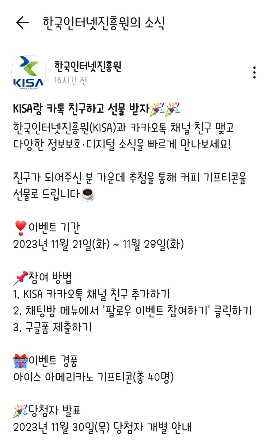 카테고리 없음 [카카오톡] 채널 친구 맺고 아메리카노(40명 추첨) 당첨되세요 (~11.28) by 노랑킹콩 2023. 11. 22. 로그인 ⭕️ http://pf.kakao.com/_wKipC 한국인터넷진흥원안녕하세요. 한국인터넷진흥원 공식 플러스친구입니다.pf.kakao.com 공유하기 게시글 관리 노랑킹콩의 여행 댓글