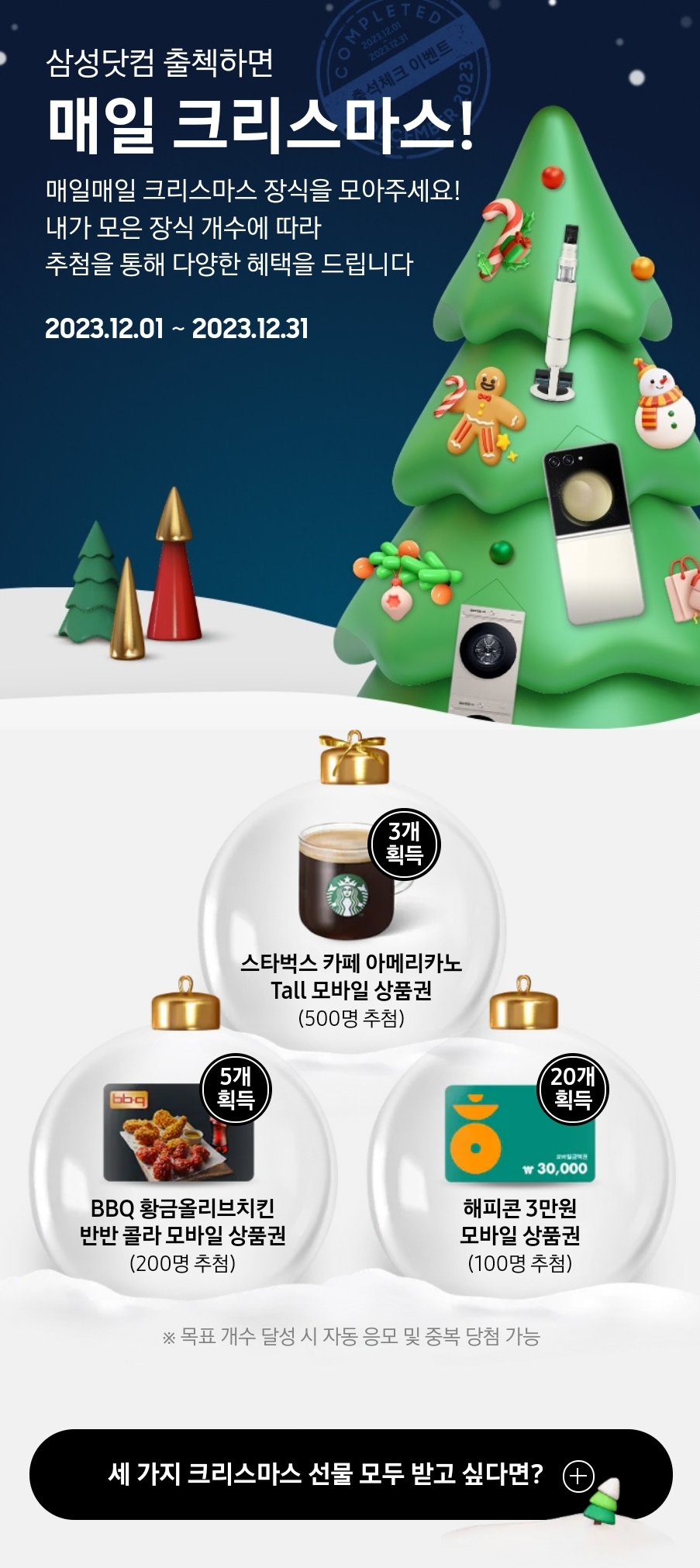 카테고리 없음 [삼성닷컴] 매일 출석하고 스벅, 치킨, 해피콘 (추첨) 당첨되세요 (~12.31) by 노랑킹콩 2023. 12. 1. 로그인 ⭕️ https://www.samsung.com/sec/event/attendanceEvent/?eventNo=32608 삼성닷컴 출첵하면 매일 크리스마스! | SAMSUNG 대한민국매일매일 크리스마스 장식을 모아주세요! 내가 모은 장식 개수에 따라 추첨을 통해 다양한 혜택을 드립니다www.samsung.com 공유하기 게시글 관리 노랑킹콩의 여행 댓글