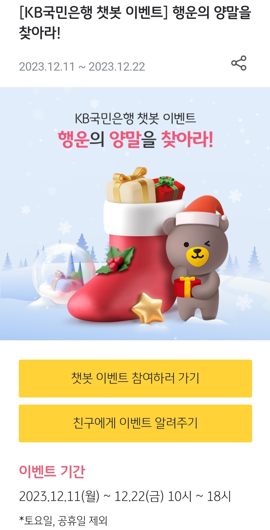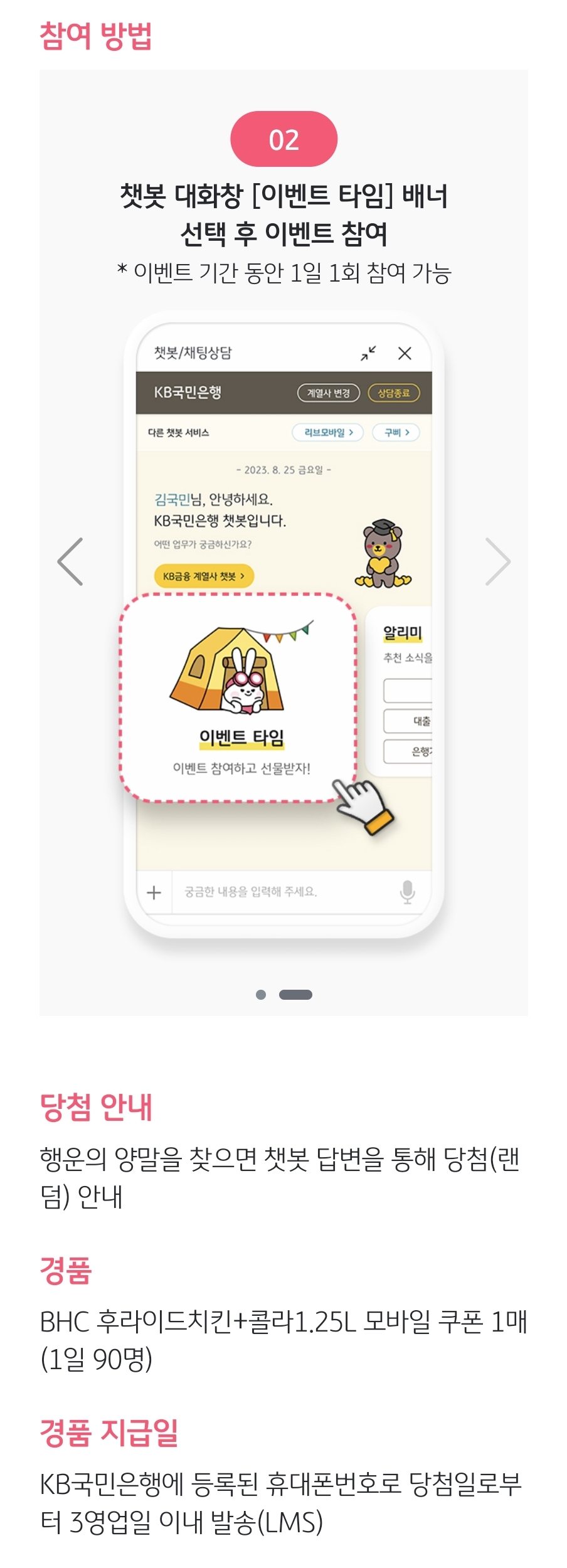 카테고리 없음 [kb pay] 챗봇 이벤트 참여하고 치킨 당첨되세요 (~12.22) by 노랑킹콩 2023. 12. 12. 로그인 ⭕️ https://obank.kbstar.com/quics?page=C041244&scheme=kbbank&pageid=D001352&urlparam=%EC%9D%B4%EB%B2%A4%ED%8A%B8%EC%9D%BC%EB%A0%A8%EB%B2%88%ED%98%B8:340691앱연동 ( KB국민은행 | 공통 | 앱연동 )요청하신 앱으로 이동합니다.obank.kbstar.com 공유하기 게시글 관리 노랑킹콩의 여행 댓글