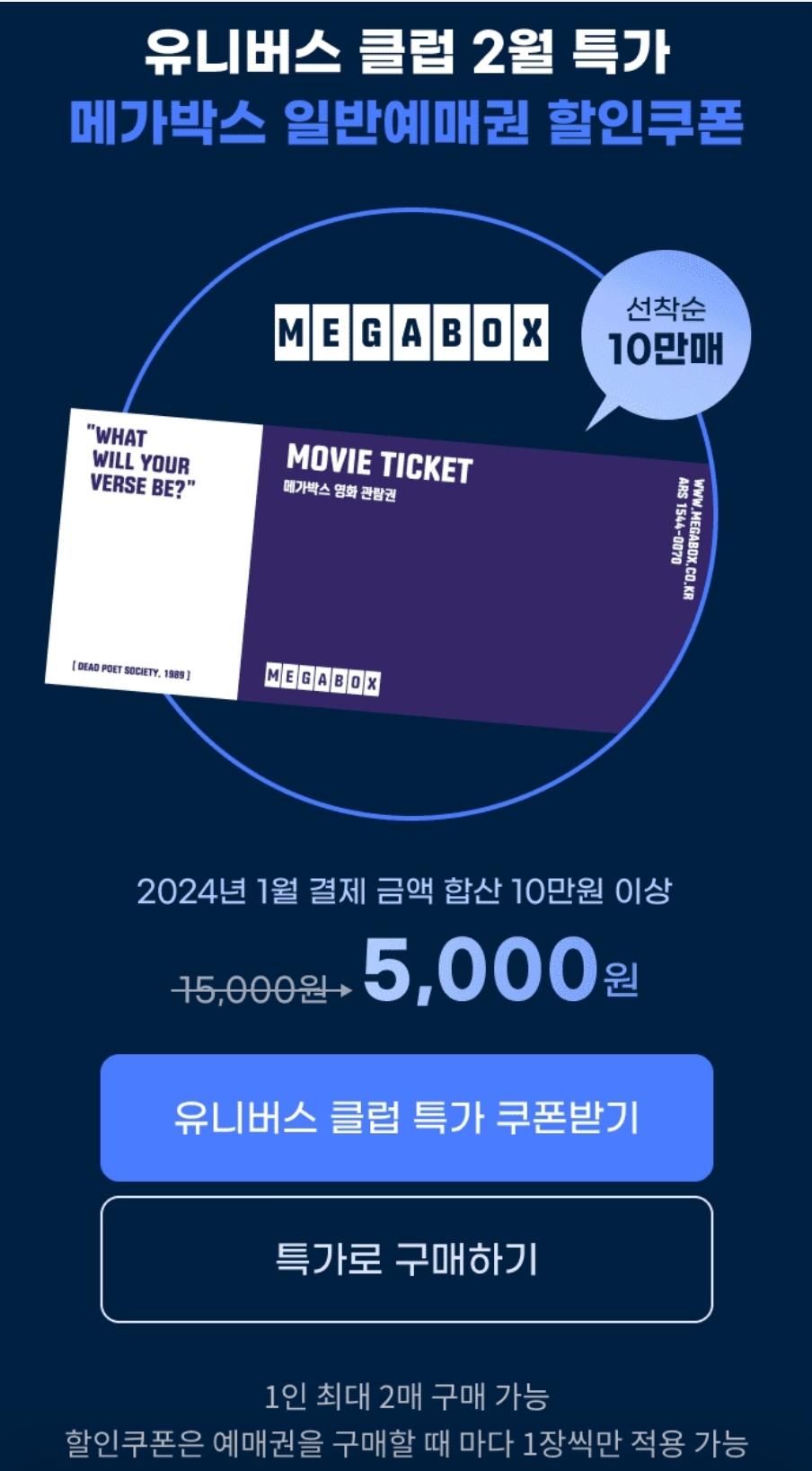 조건 되신분들 쿠폰받아서 메가박스 티켓 5,000원에 구매하시면 돼요~