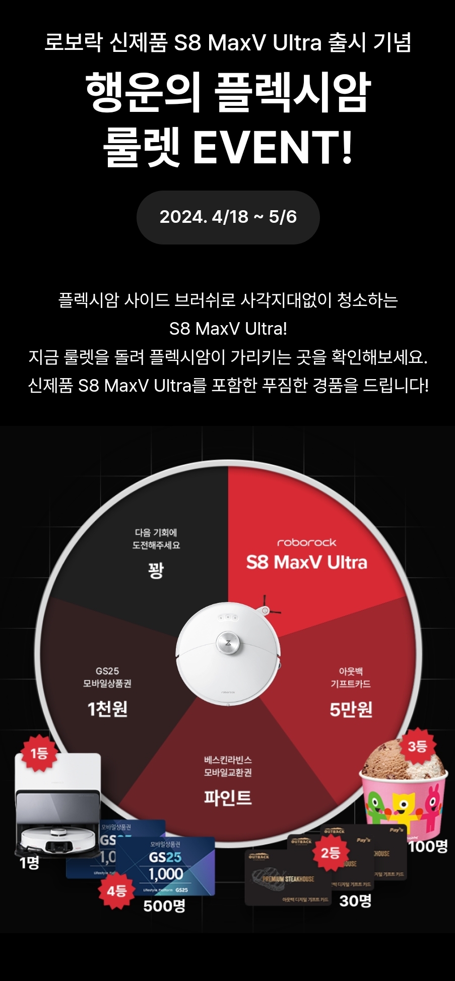 카테고리 없음 [로보락] 신제품 출시기념 룰렛 돌려보세요 (~5.6) by 노랑킹콩 2024. 4. 18. 로그인 ❌️ https://meet-roborock.com/event/event_roulette.html 로보락 S8 MaxV Ultra 출시로보락의 등장, 청소의 종말 지금 바로 확인해보세요.meet-roborock.com 공유하기 게시글 관리 노랑킹콩의 여행 댓글
