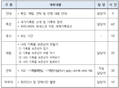 내 용 : (특강)기록문화, (체험)보존상자만들기, (견학)기획전시실, 서고 등