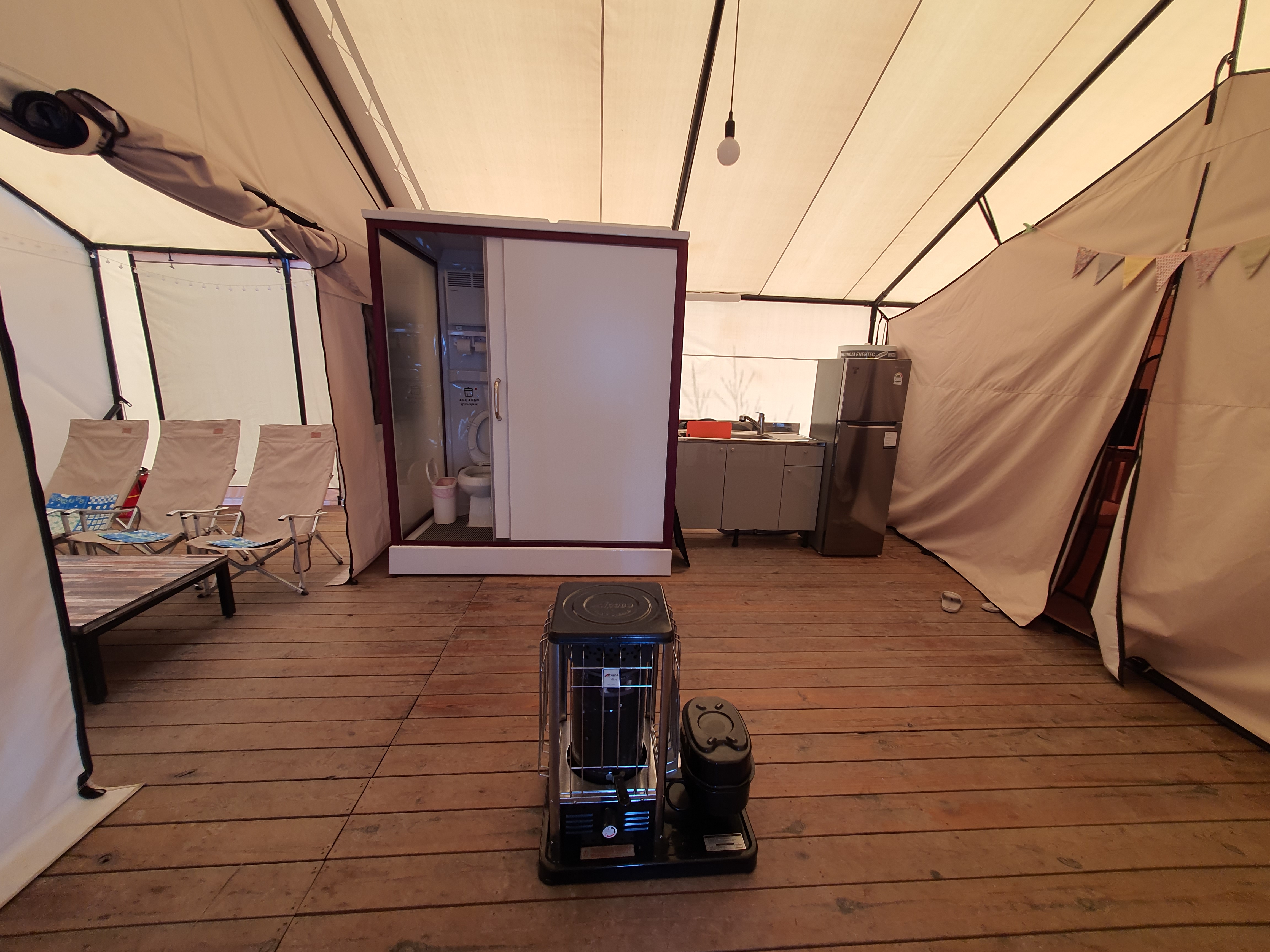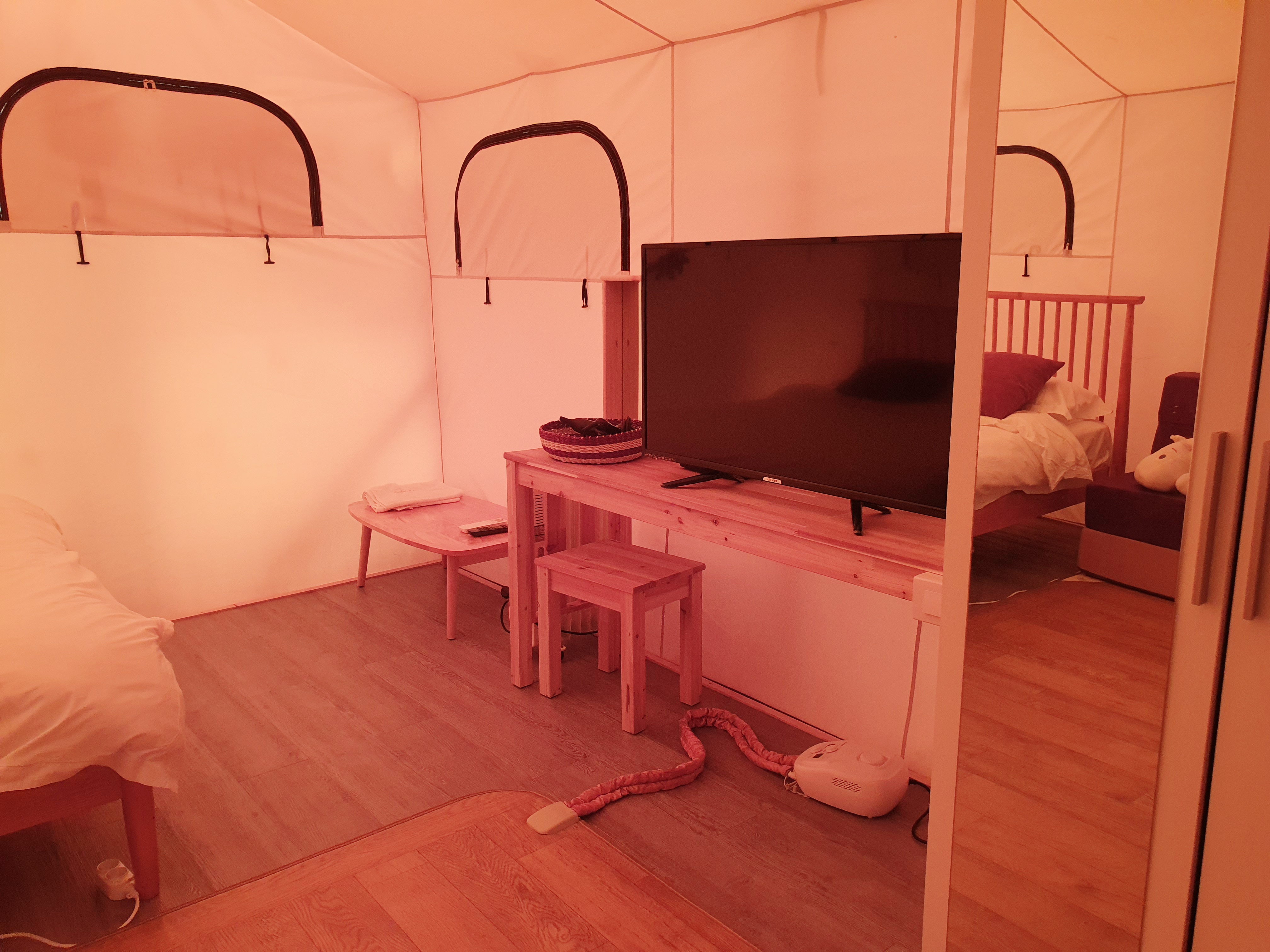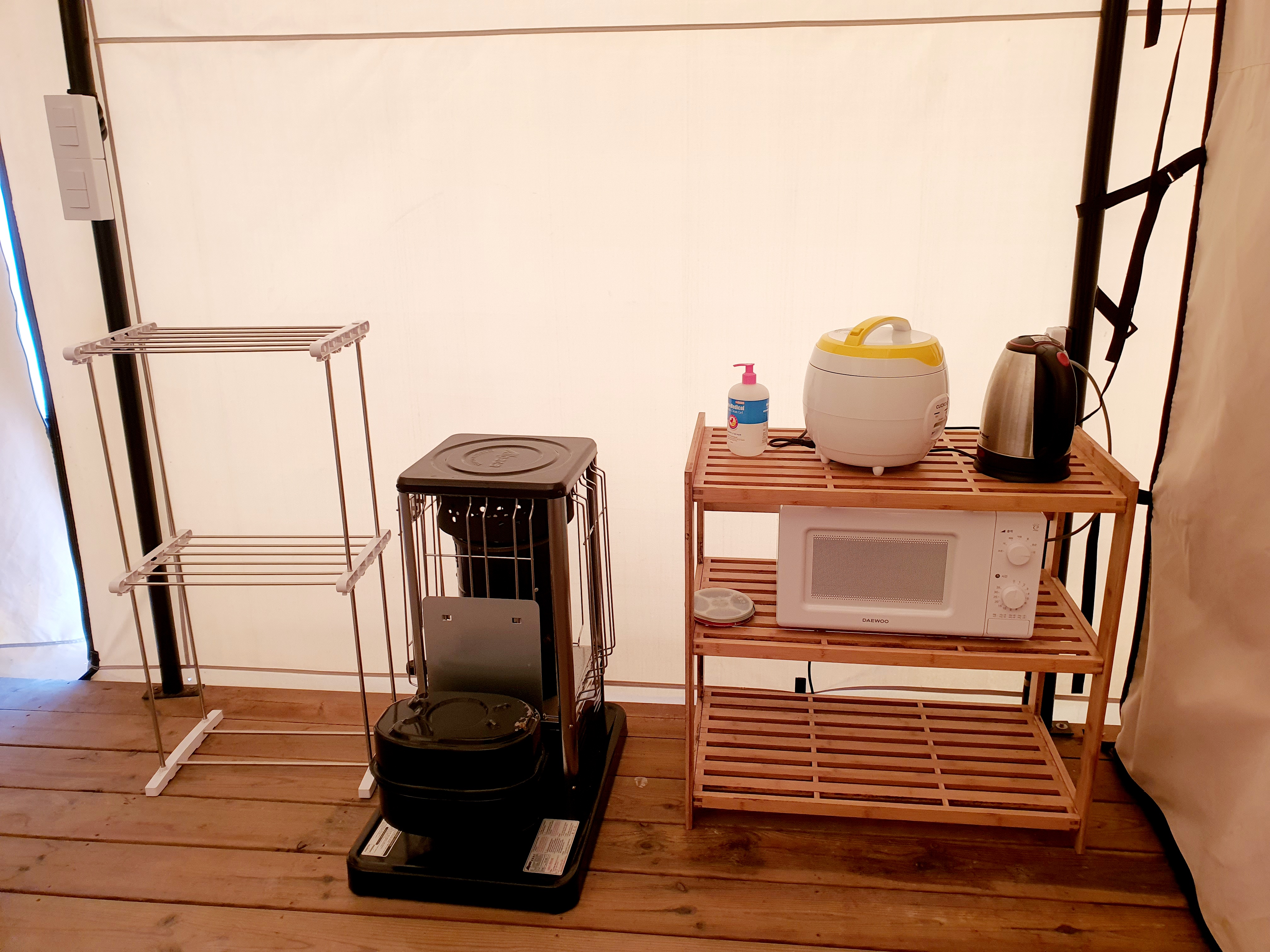 퀸침대 1개, 호텔식 침구, 변형 침대매트리스 2개 , 냉난방기, 선풍기, TV, 와이파이, 드라이기, 전기장판 2개, 전자렌지, 전기밥솥, 커피포트, 건조대, 2구버너, 220리터 대형온수기, 개별화장실(샴푸, 린스, 바디워시), 개별싱크대(대형냄비, 소형냄비, 후라이팬, 칼, 도마, 집게 등 기본식기세트), 전용화로대, 숯 웨버그릴, 실내외 테이블 2세트(4인기준), 개별파라솔