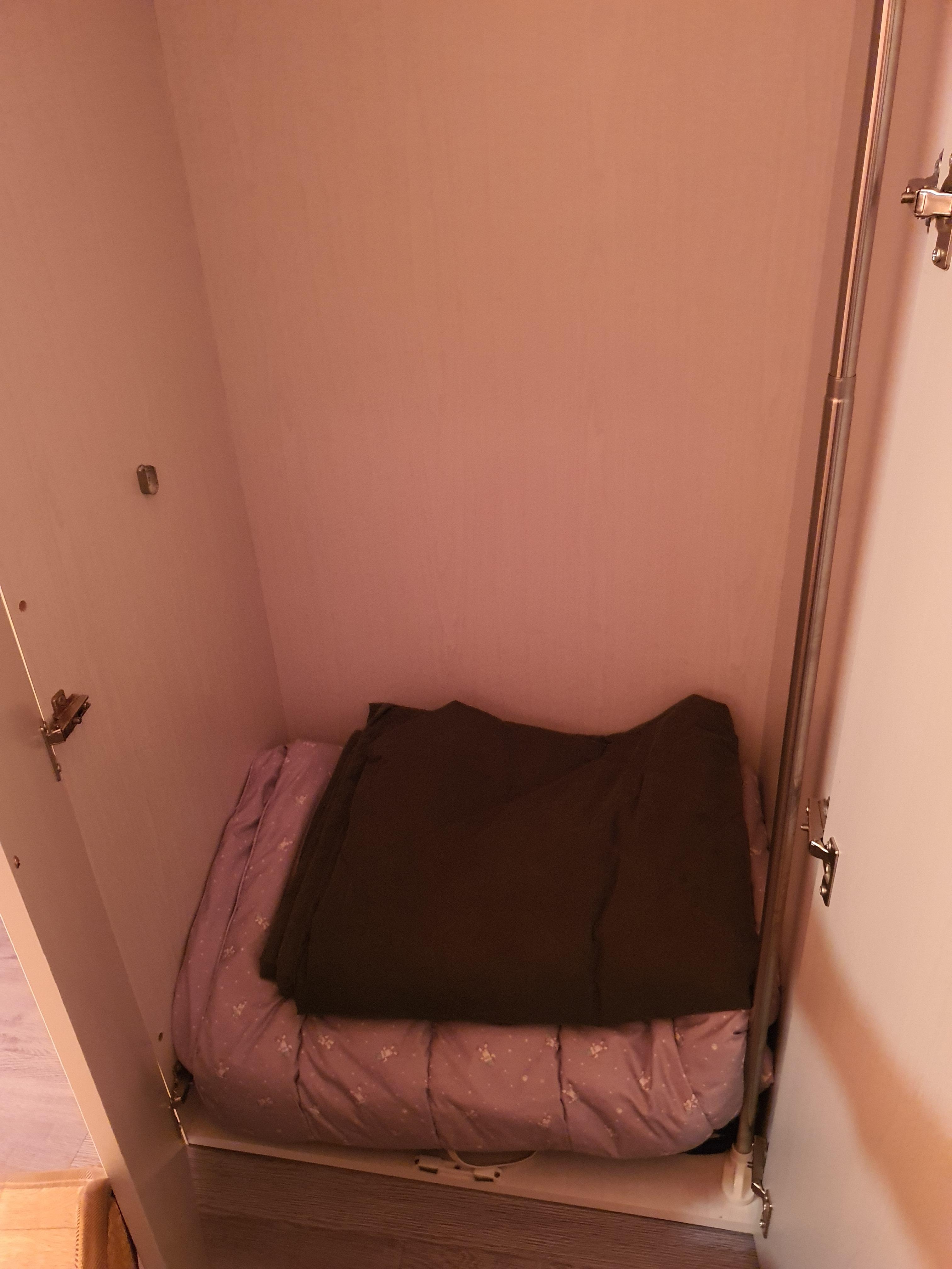 그 서랍장 옆에 세워져있는 히터, 온수매트, 침대 위 전기장판, 공기를 따뜻하게 해줄 냉난방기까지 있어서 절대 춥지 않아요^^
