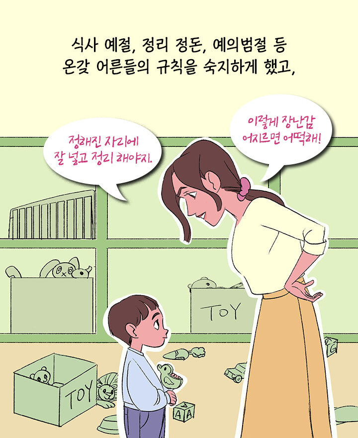 아이를 잘키우겠다는 일념으로 식사 예절, 정리 정돈 등 온갖 어른들의 예절을 가르쳤고