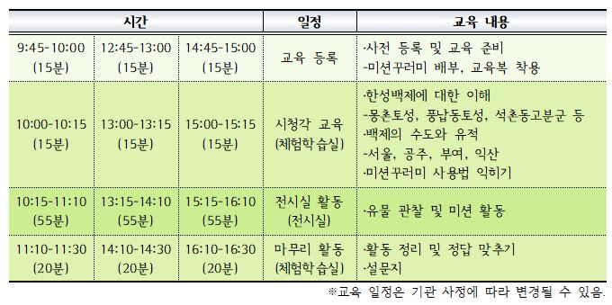 (몽촌역사관 학예연구실 02-2152-5899/02-2152-5895, ※무단결석 시 한 달 동안 서울시 공공서비스예약 이용을 제한할 수 있습니다)