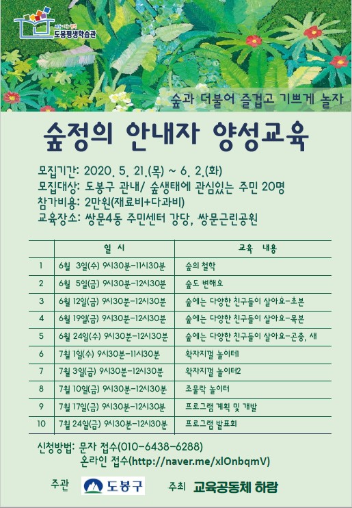 2020 도봉구 우수 평생교육 프로그램으로 숲의 가치와 보존, 회복에 대한 이해와 숲놀이를 배우고 프로그램을 계획, 운영하는 숲정의 안내자가 되어 청소년의 학습 및 지역 주민들의 치유 활동을 하고자 합니다.