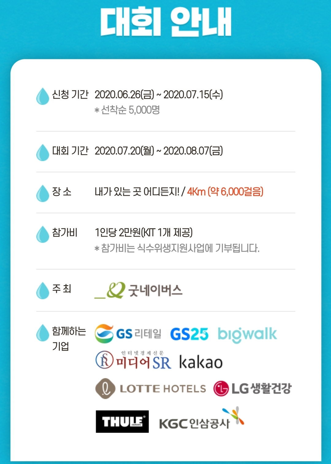 참가자들은 대회 기간 중 원하는 시간에 ‘굿워터 키트’를 활용해 사회적 거리두기를 준수할 수 있는 장소에서 4km 이상 걸으면 되고 참가비 2만 원은 전액 기부됩니다.