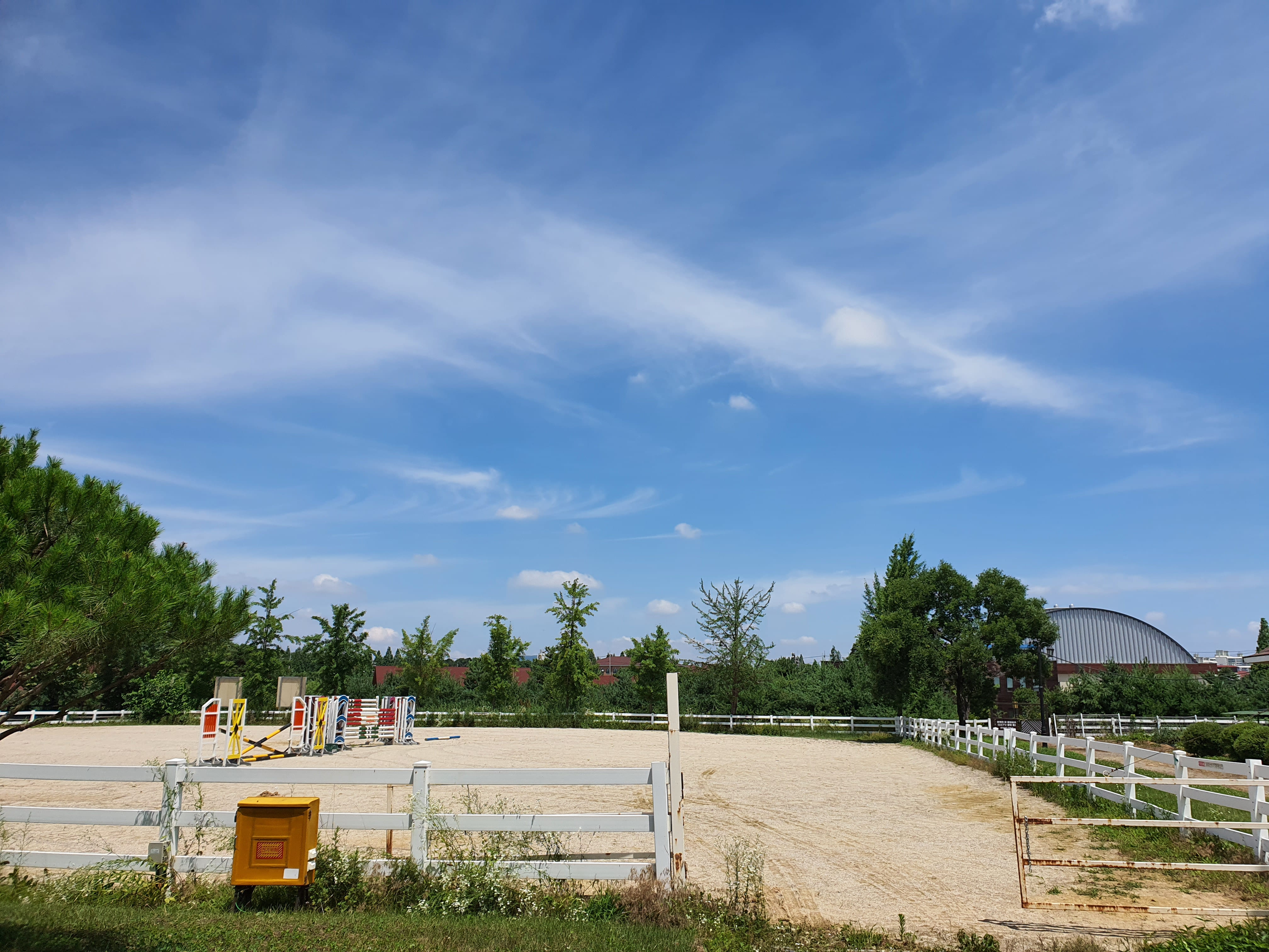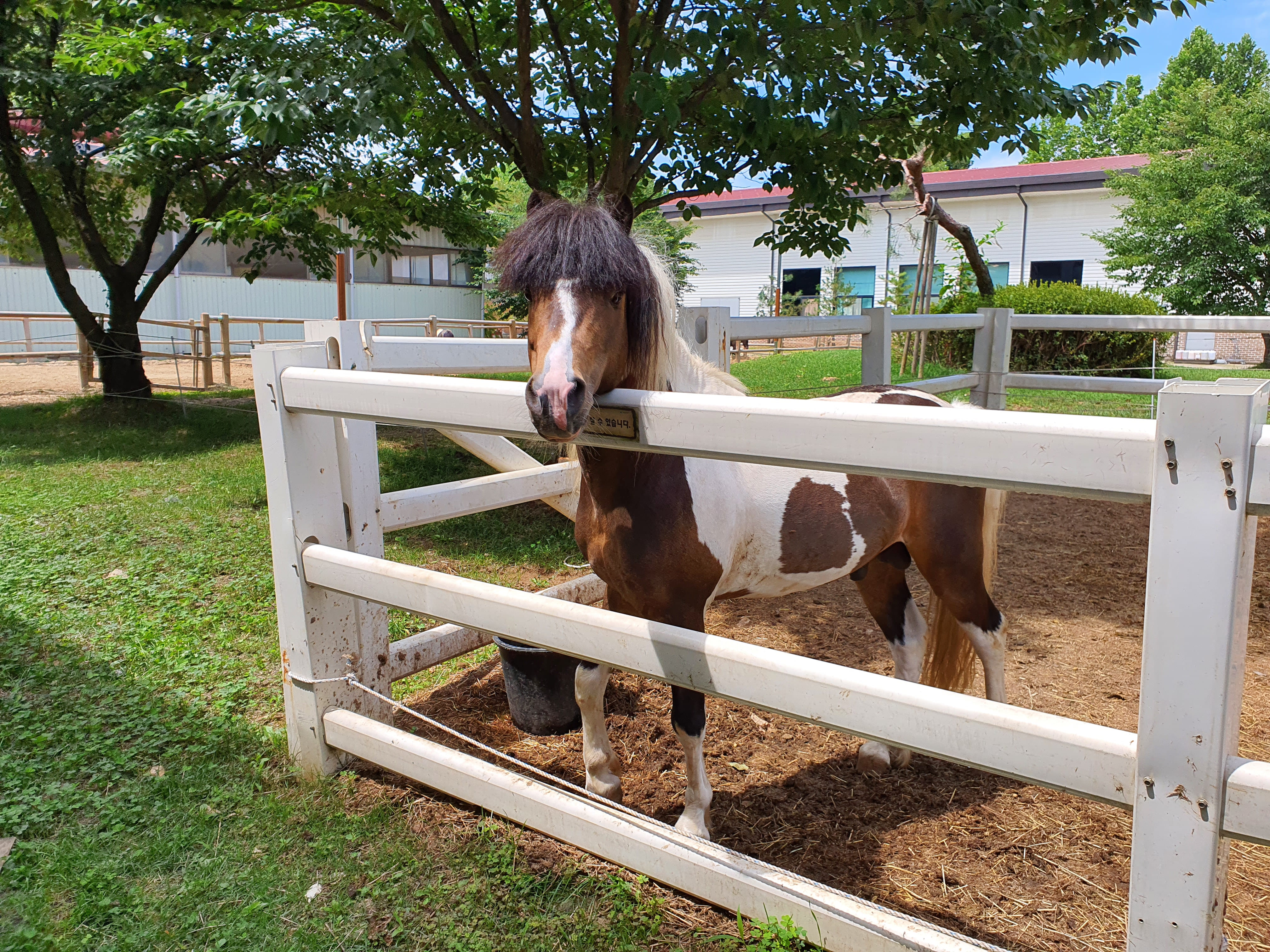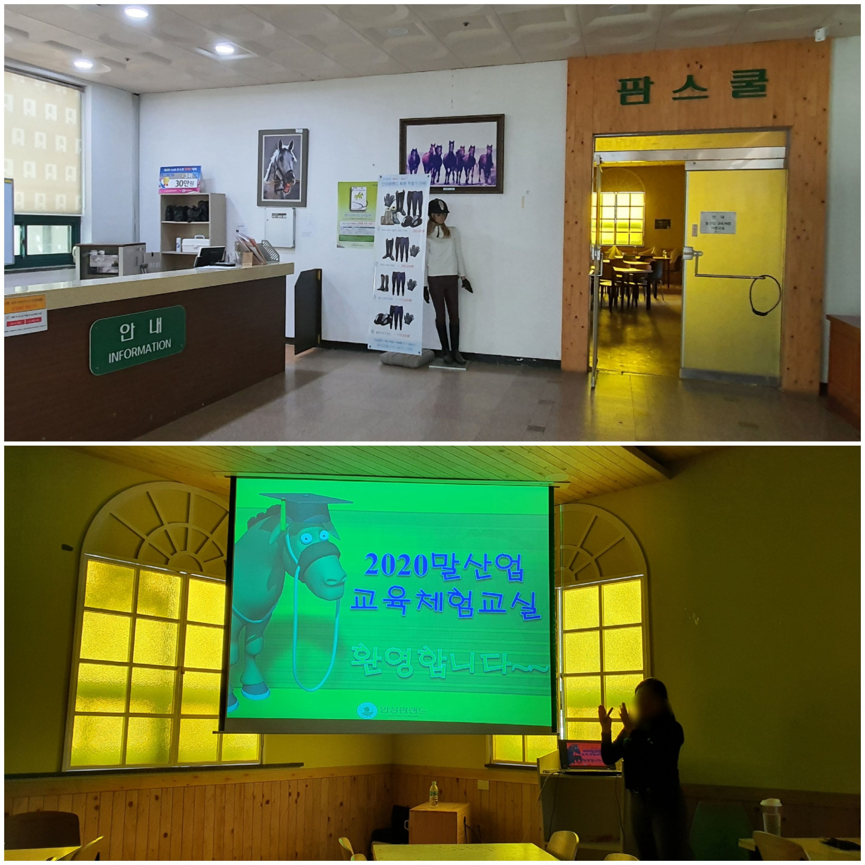 데크를 올라가시면 앞쪽으로 마구간이 보이고, 그 맞은편에 이론수업을 들을 클럽하우스·팜스쿨가 있어 그곳에서 이론수업을 먼저 들을거에요 🐴