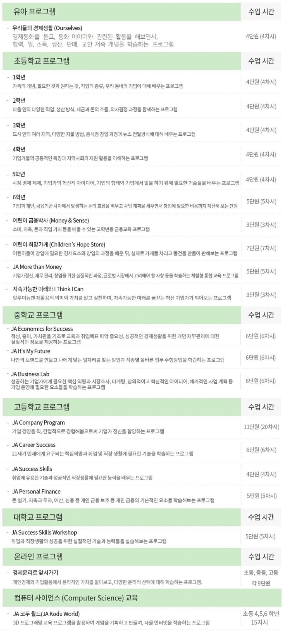 오늘 포스팅한 JA Company of the Year(COY)는 고등학생들 프로그램이지만 JA Korea에서는 유아, 초등학생, 중학생 등을 위한 프로그램들이 다양하게 운영되고 있으니 아래에 올린 교육커리큘럼을 참고해주세요^^