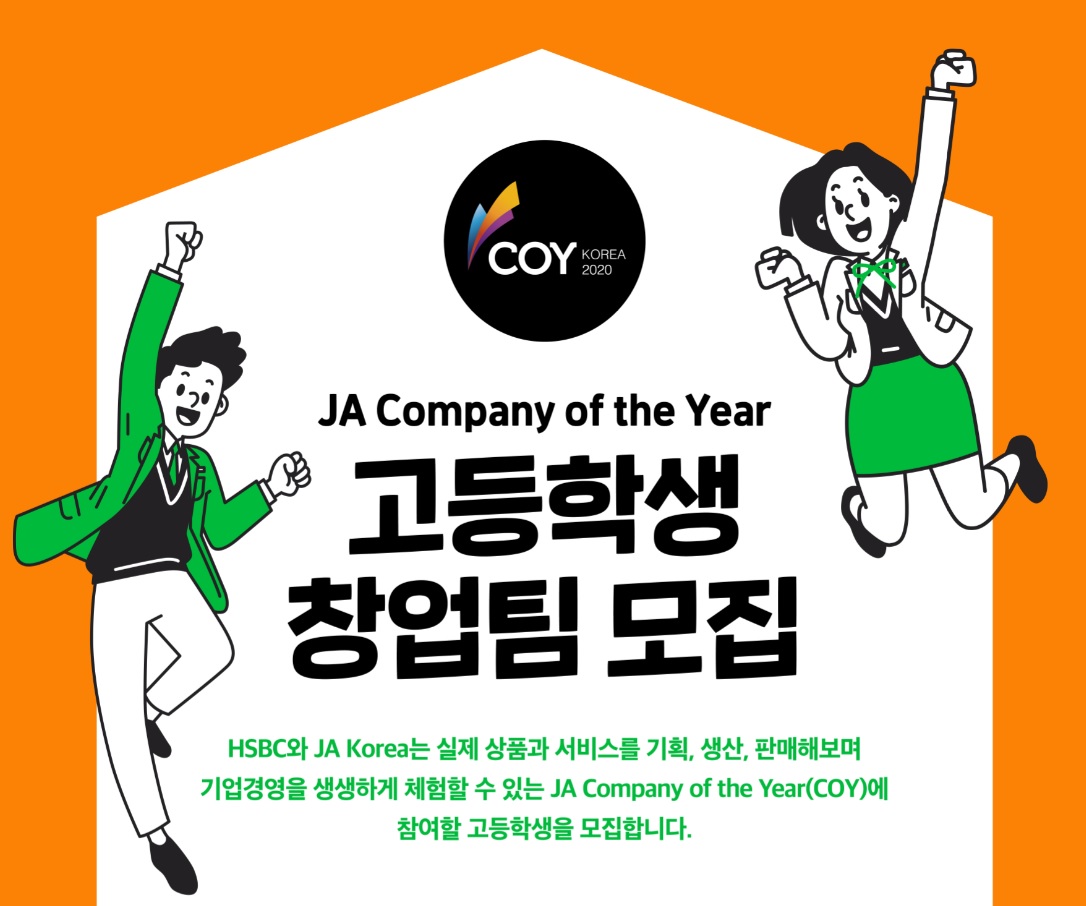 HSBC와 JA Korea는 실제 상품과 서비스를 기획, 생산, 판매해보며 기업경영을 생생하게 체험할 수 있는 JA Company of the Year(COY)에 참여할 고등학생을 모집합니다.