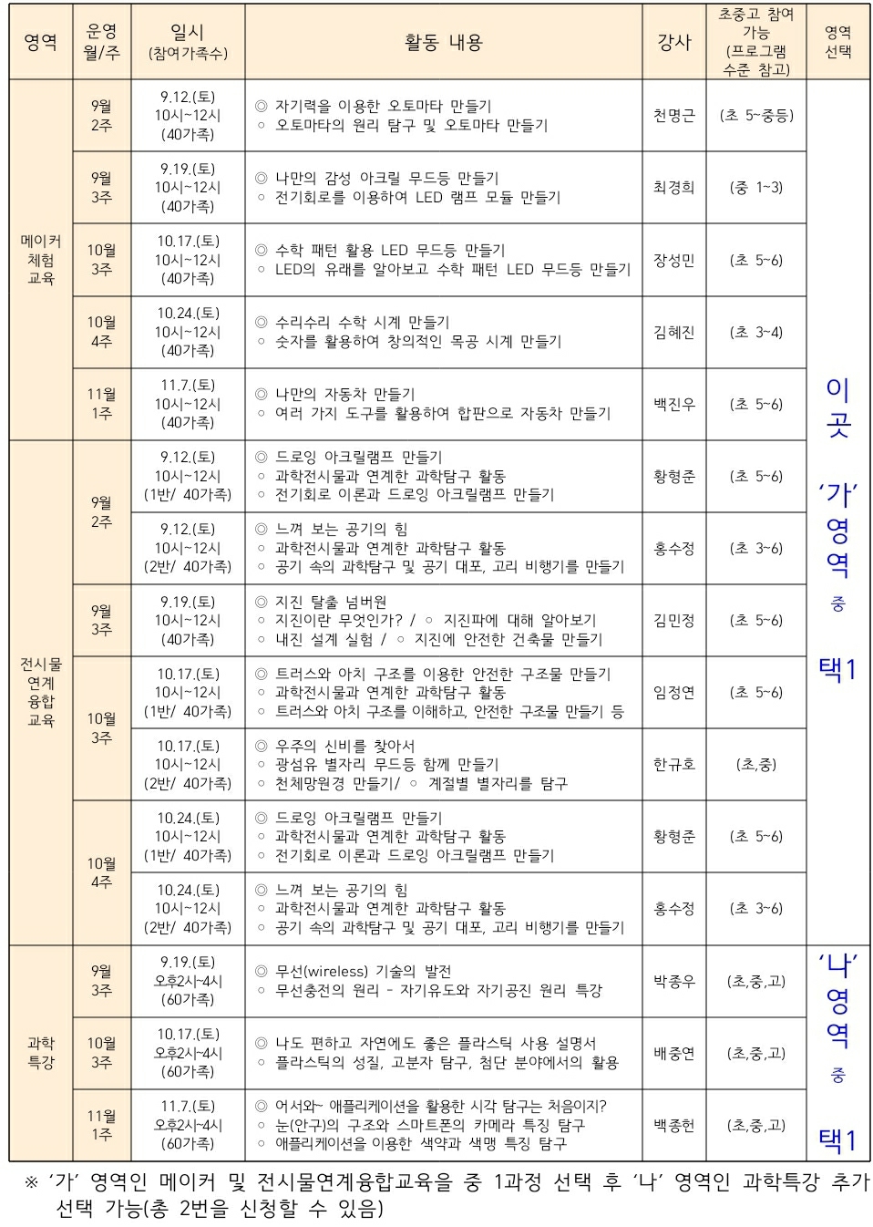 ( 가족단위 1 회 신청 가능, 메이커체험교육 및 전시물연계융합교육 영역 내에서는 1 강좌 선택 가능)