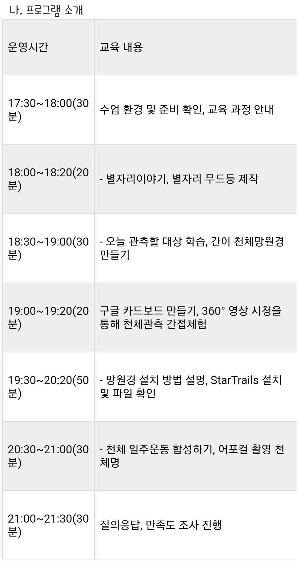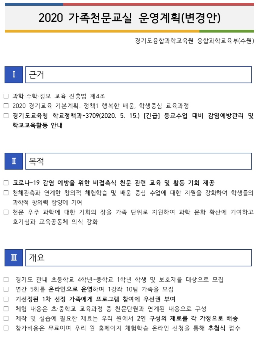 비접촉식 교육을 지원하고자 기존에 안내 드린 < 2020 가족천문교실> 을 아래와 같이 변경하여 운영하오니 많은 관심 부탁드립니다.