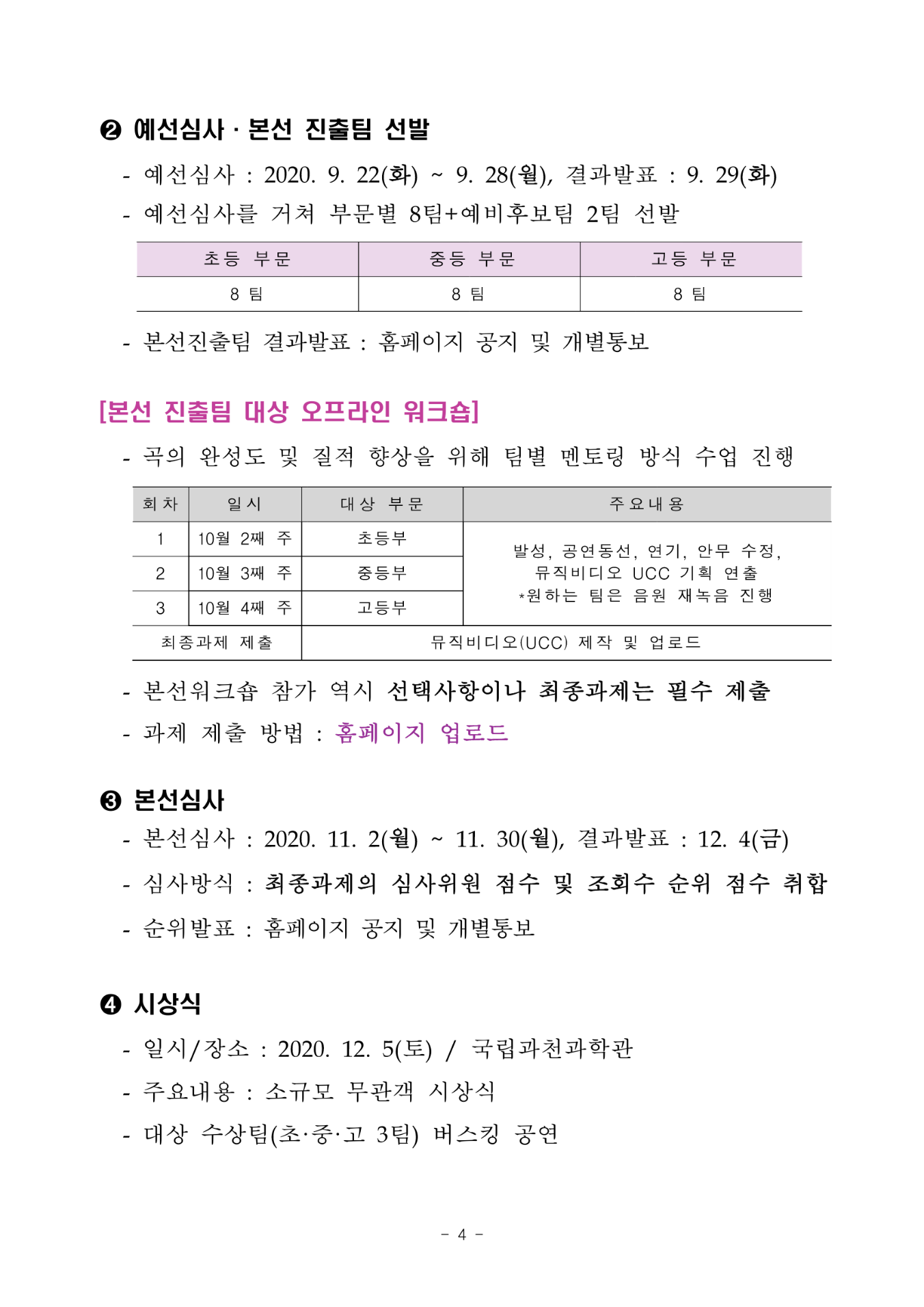 2020 온라인 청소년 과학송 경연대회 행사일정 안내 2020 청소년 과학송 경연대회는 올해 대회 10주년을 맞아 비대면 방식의 온라인 대회로 재탄생 되었습니다.올해는 특별히 온오프라인의 과학송