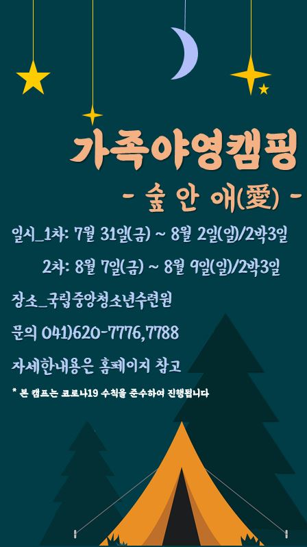 국립중앙청소년수련원에서는 오는 7월 31일(금) ~ 8월 2일(일)과 8월 7일(금) ~ 8월 9일(일) 까지