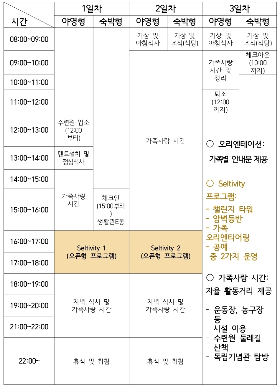 2박 3일 캠프기간 중 캠핑과 자율 참여 프로그램이 결합하여 진행됩니다.
