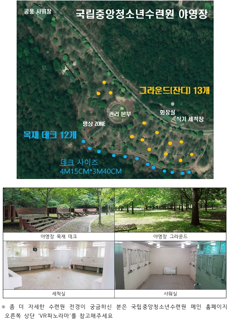 수련원 야영장내에는 매점, 마트, 장비 대여소 등이 없습니다.