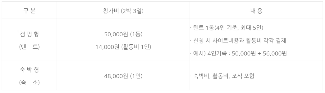 - 텐트 1동 사이트(장소) 비용(50.000원)은 참가비와 별도 인 기본 비용으로 옵션이 아닌 필수