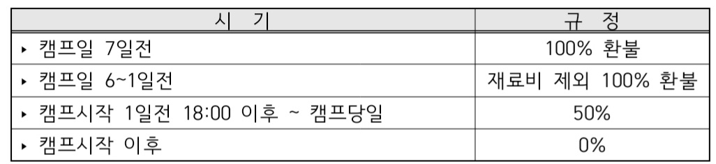 캠프실시 3일전까지 30명 이하 예약 시 취소