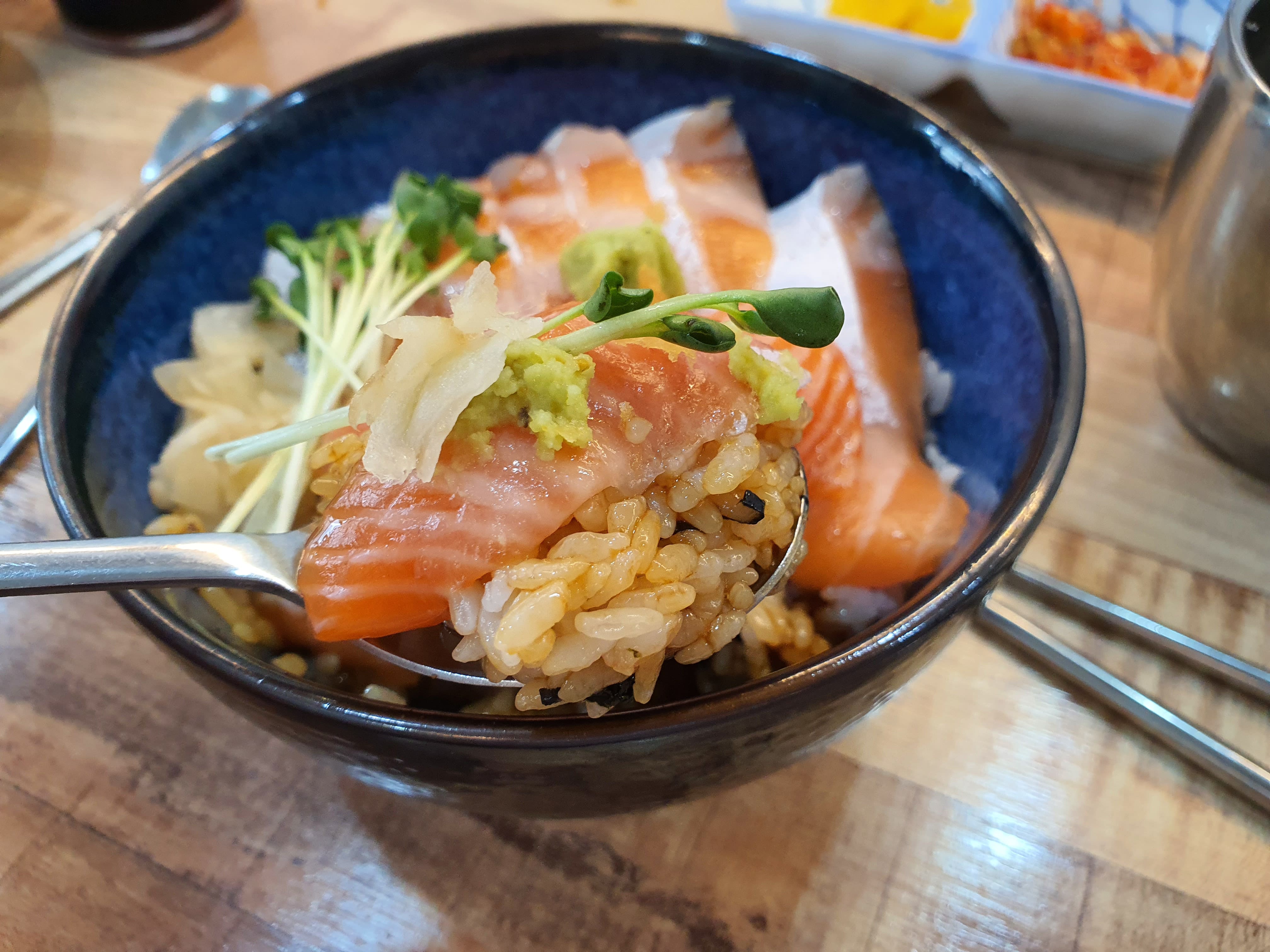 '사케동 맛있게 먹는법한번에 비비지 마시고 연어를 간장에 찍어서 밥과 함께와사비, 무순, 초생강을 같이 올려서 드시면 더욱 맛있습니다.'