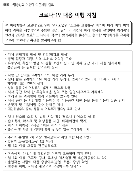 * 본 행사는 코로나19 위기 상황에서 잔행되는 관계로, 참가자의 안전을 위해 아래와 같은 대응 지침을 마련하여 운영함