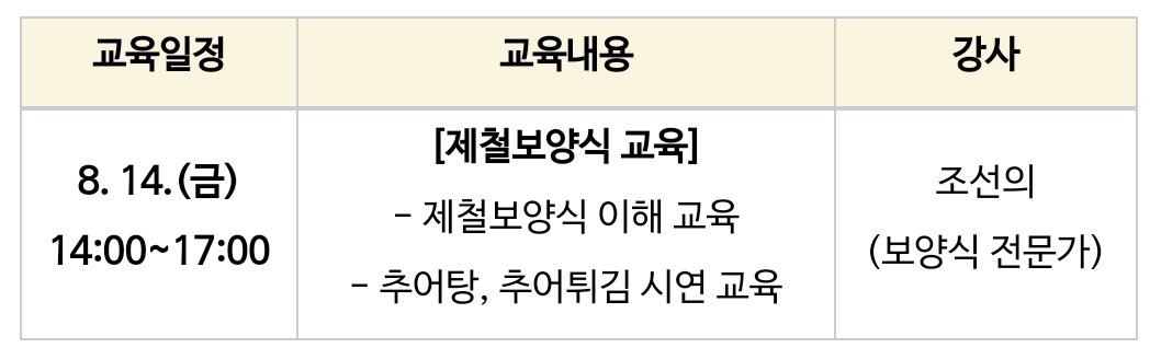서울시농업기술센터에서 제철농산물을 이용한 제철 보양식 무료 교육을 8월 14일(금) 오후 2시부터 5시까지 서울시민 100명을 대상으로 온라인 비대면으로 진행합니다. 많은 관심과 신청 바랍니다.