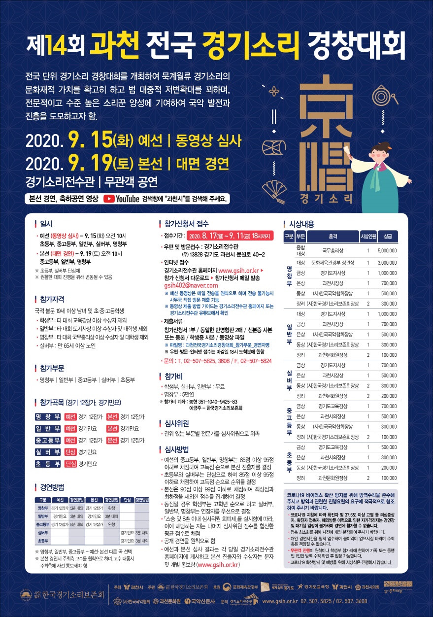 - 예선 (동영상 심사) - 9. 15(화) 오전 10시 ㅣ 초등부, 중고등부, 일반부, 실버부, 명창부