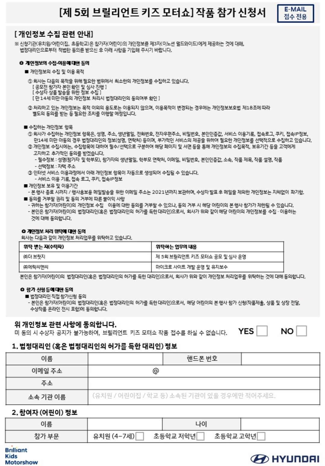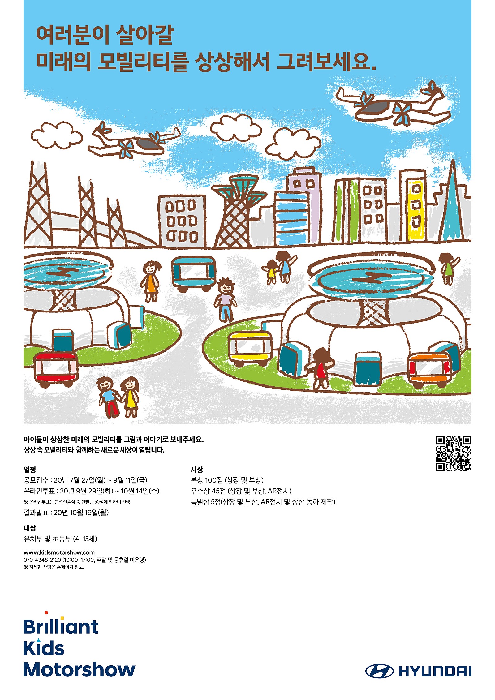 현대자동차에서 진행하는 어린이 그림 공모전 "제5회 브릴리언트 키즈 모터쇼" 여러분이 살아갈 미래의 모빌리티를 상상해서 그려보세요.