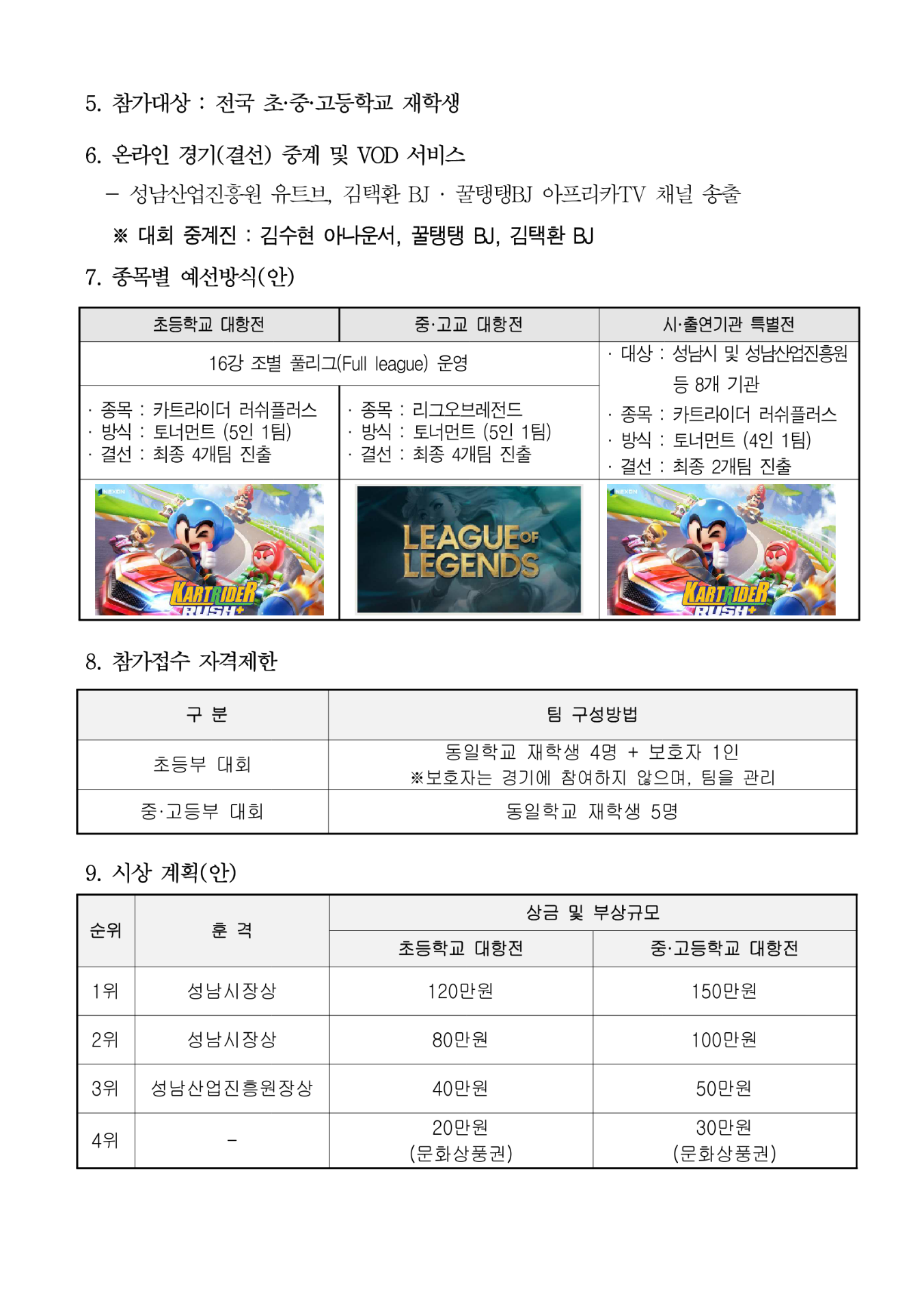 성남산업진흥원에서는 건전한 게임문화 확산 및 저변확대를 위해'성낭 아마추어 e스포츠대회'사업을 추진하고 있습니다. 동 사업과관련하여 아래와 같이 대회를 개최하오니 관심있는 학생은참여바랍니다.