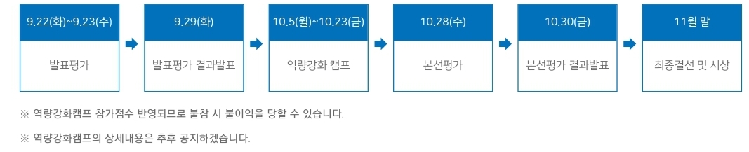 - 1차 서류평가, 2차 발표평가, 역량강화캠프 + 본선평가, 최종결선 순(4단계)