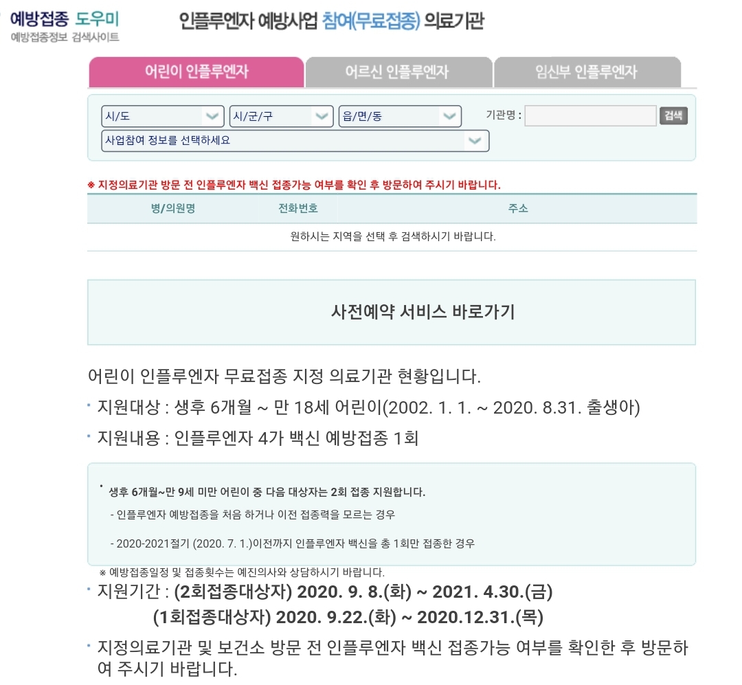 · 생후 6개월 ~ 만 18세 어린이는 지정 의료기관 및 보건소를 이용하시면 주소지에 관계없이 전국 어디서나 무료로 인플루엔자 예방접종을 받으실 수 있습니다.