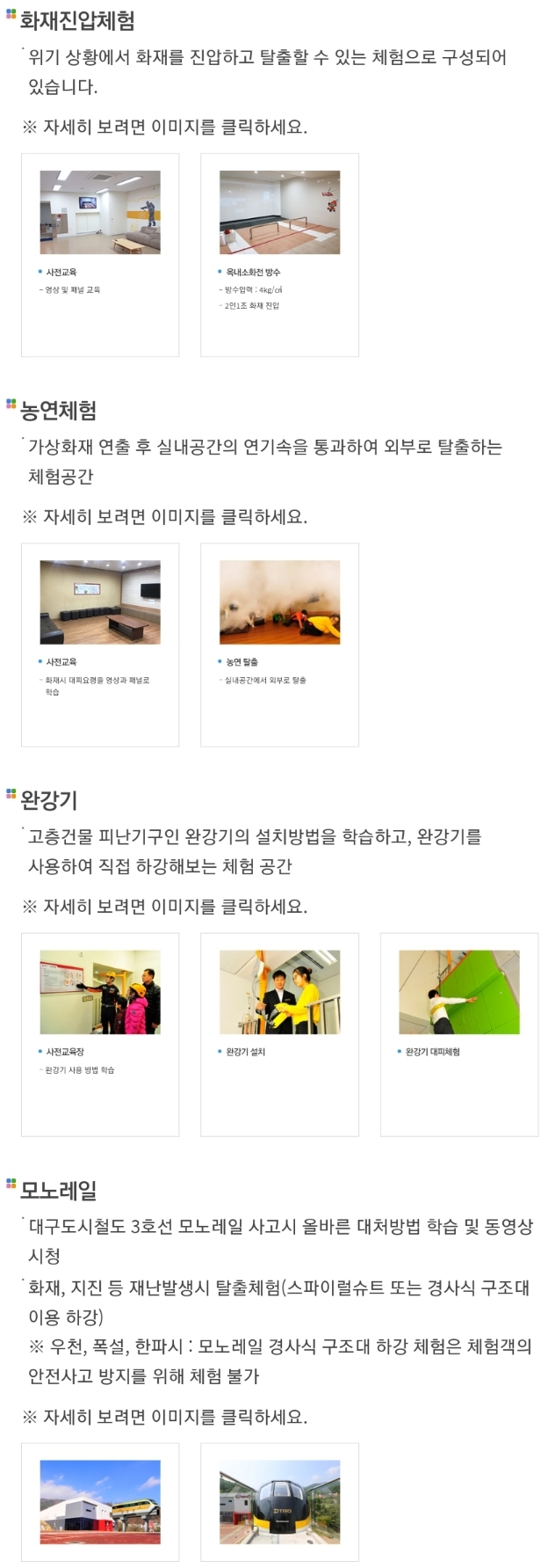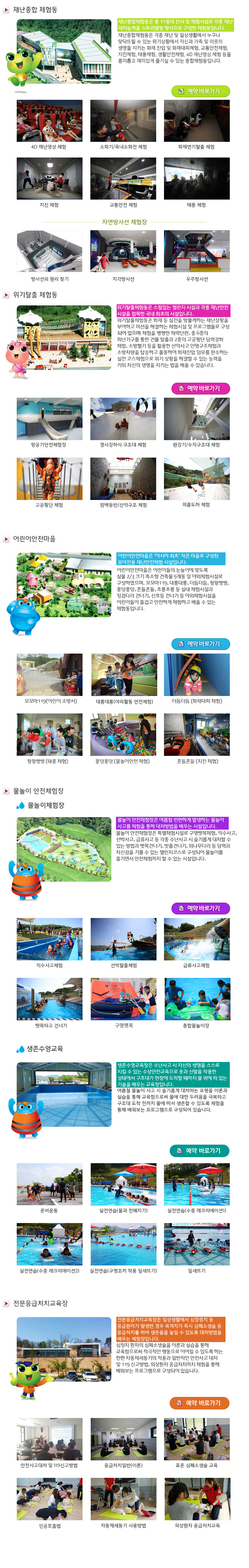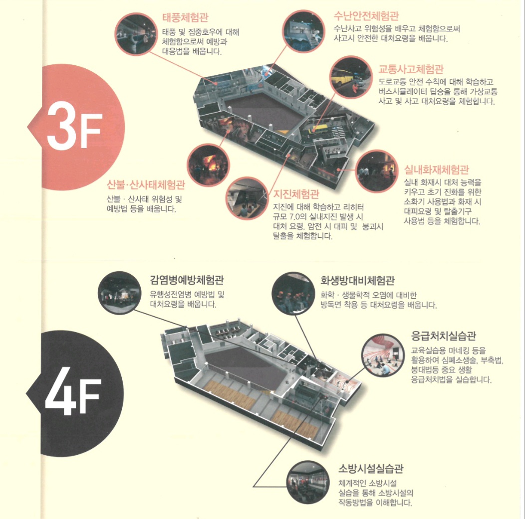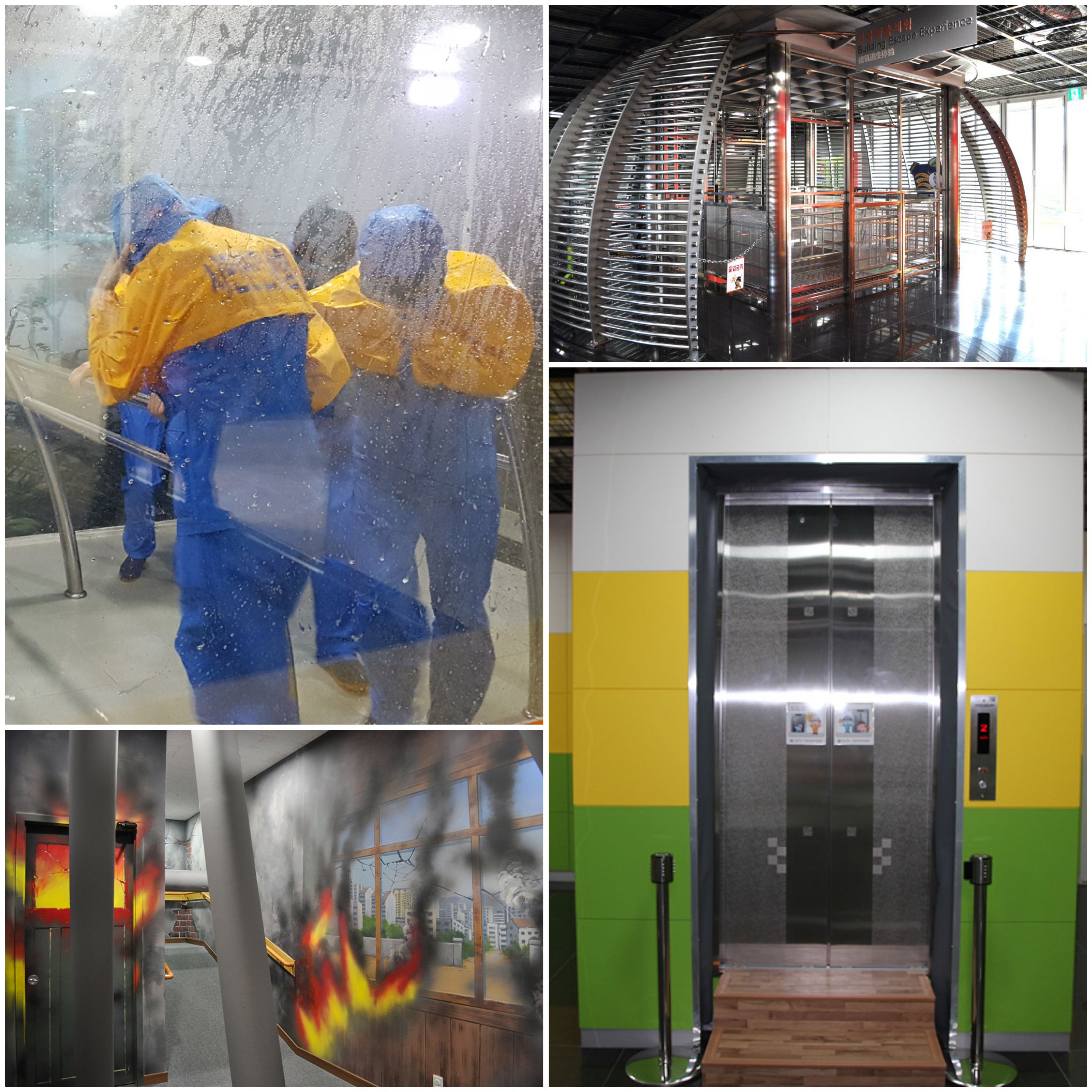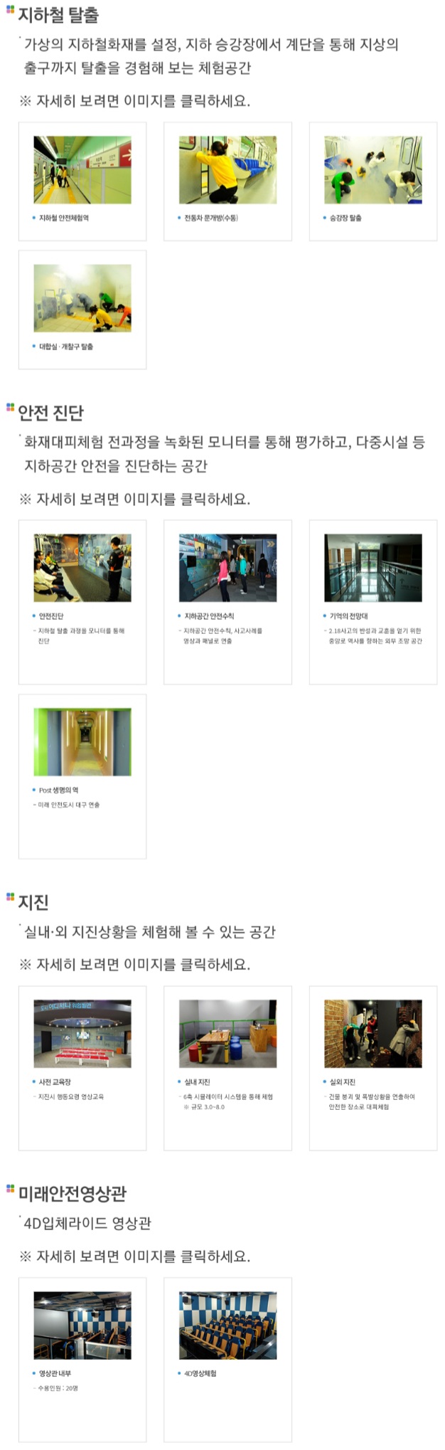 지진체험 / 태풍체험 / 선박탈출체험 / 소화기 사용법 체험 / 지하철 체험 / 승강기 안전 체험 / 화재 대피체험 / 실내건물 탈출 체험 / 생활 안전 체험 / 야외 탈출 체험 / 4D 라이더 체험