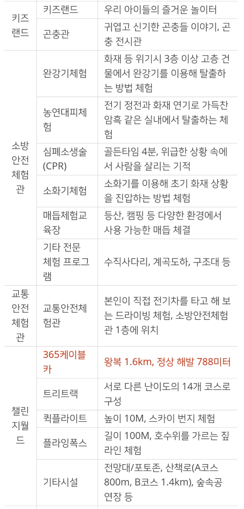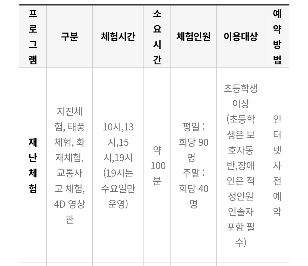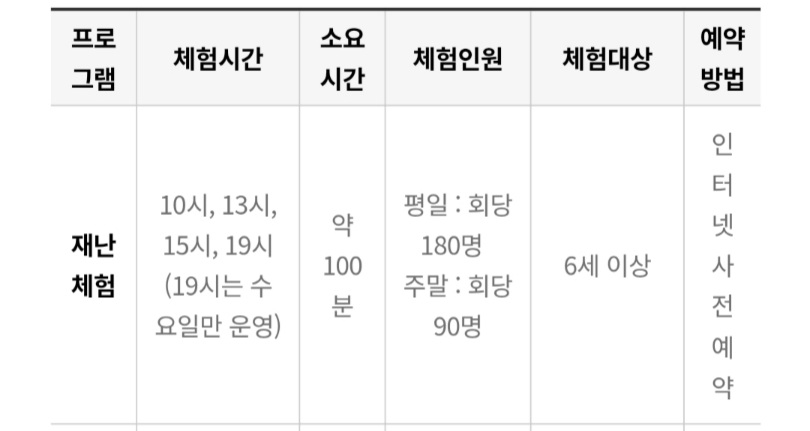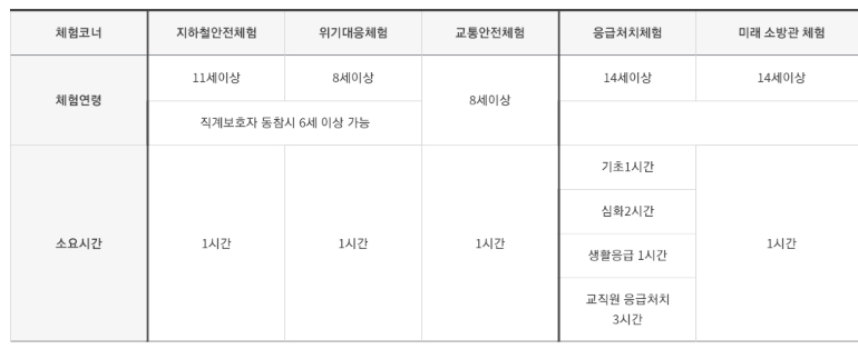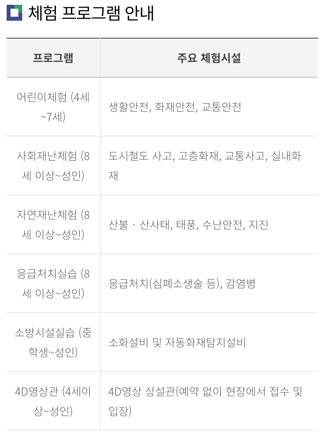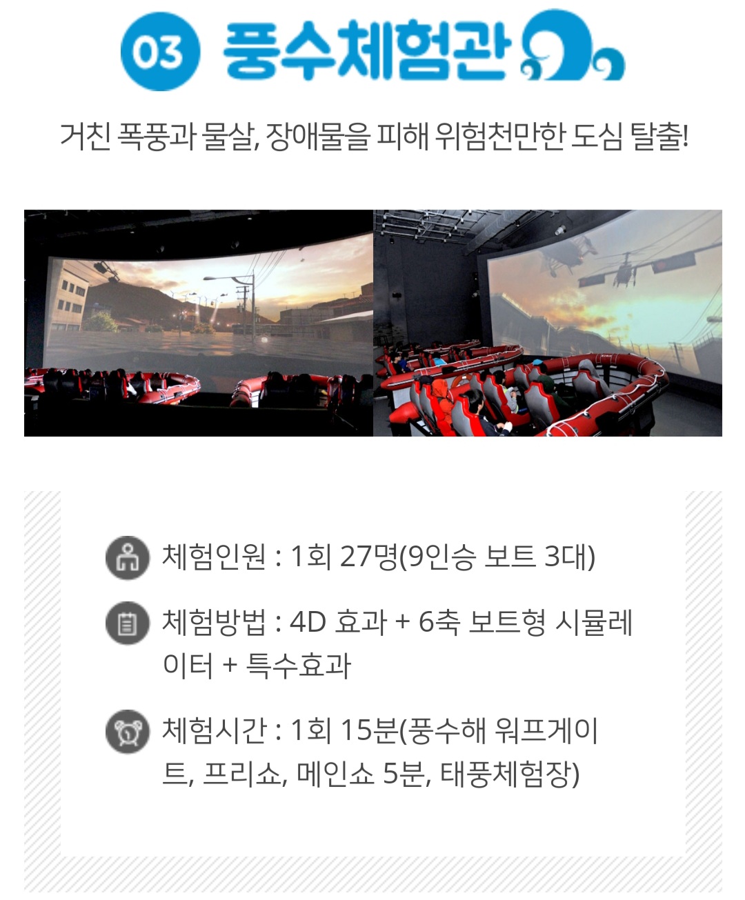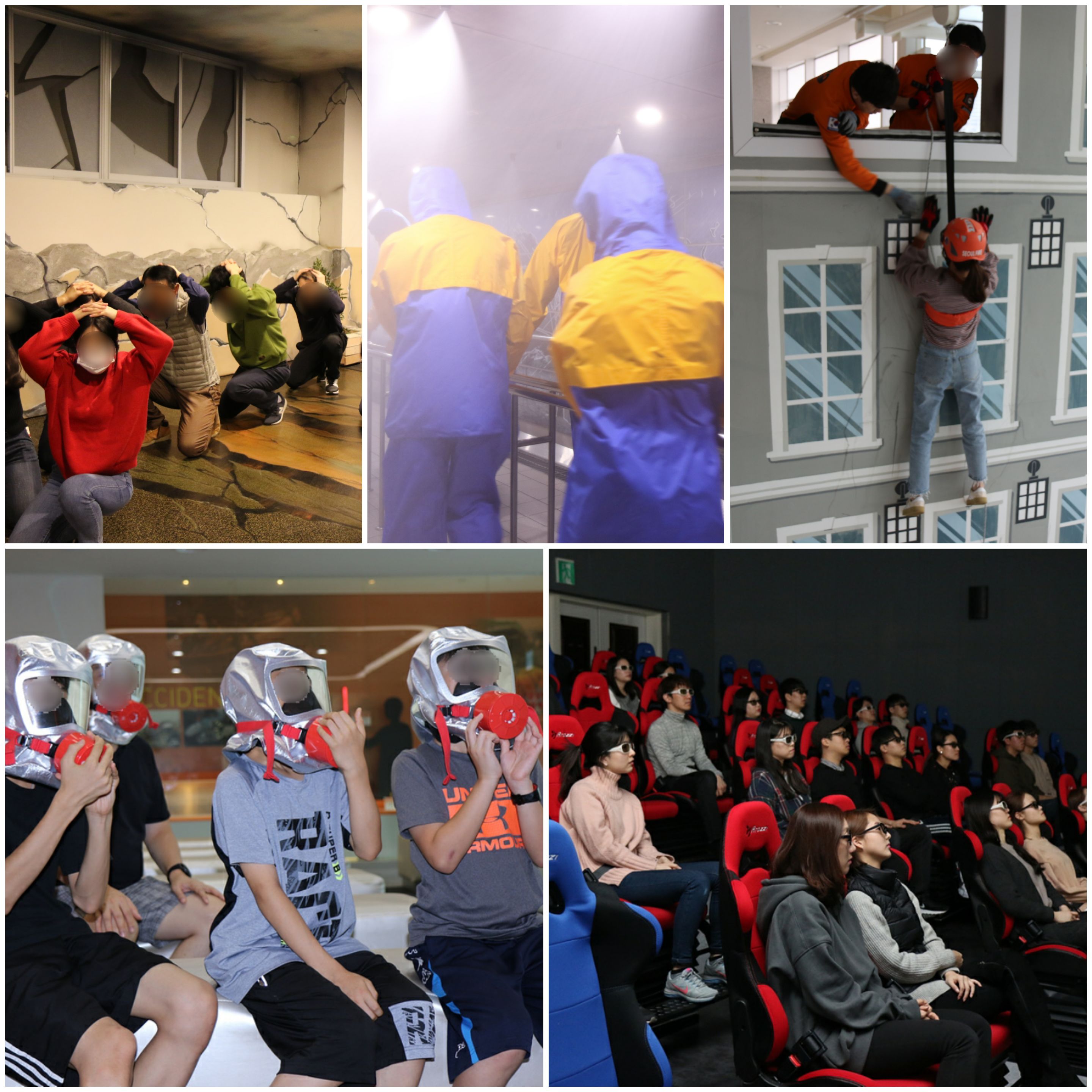 지진체험 / 태풍체험 / 선박탈출체험 / 소화기 사용법 체험 / 지하철 체험 / 승강기 안전 체험 / 화재 대피체험 / 실내건물 탈출 체험 / 생활 안전 체험 / 야외 탈출 체험 / 4D 라이더 체험
