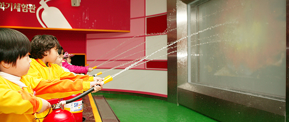 소화기체험관 : 물소화기를 이용하여 불을 직접 끄는 방법을 배우고 체험하는 공간입니다.