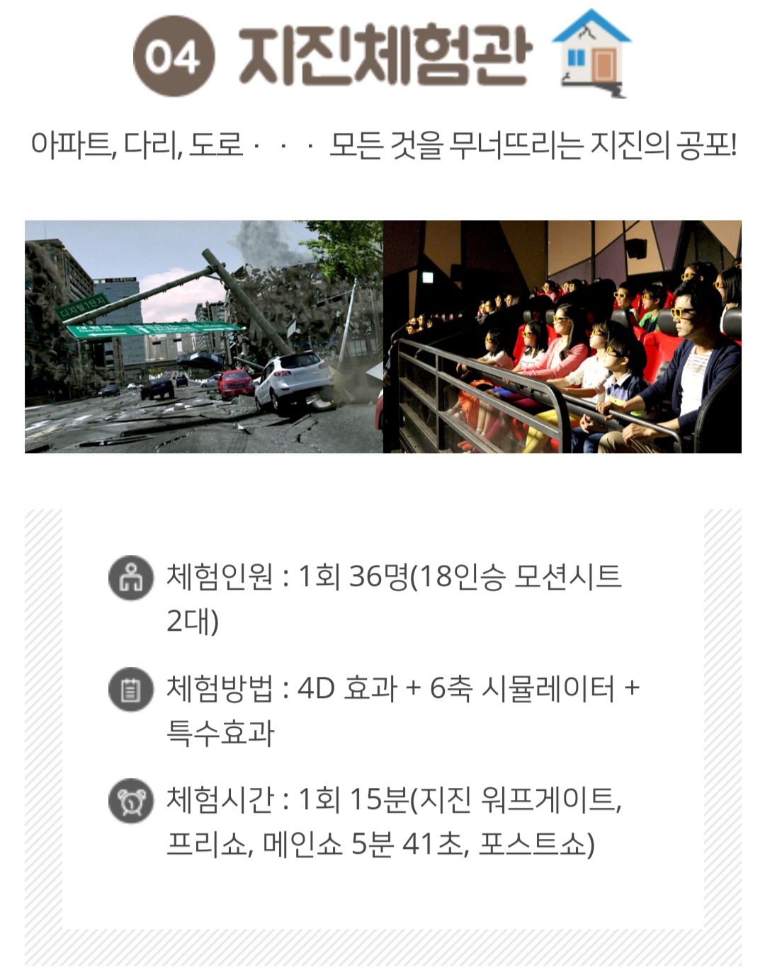 지진체험관 : 지진 발생시 대피 요령을 배울 수 있으며, 설제 지진의 흔들림을 체험할 수 있습니다.