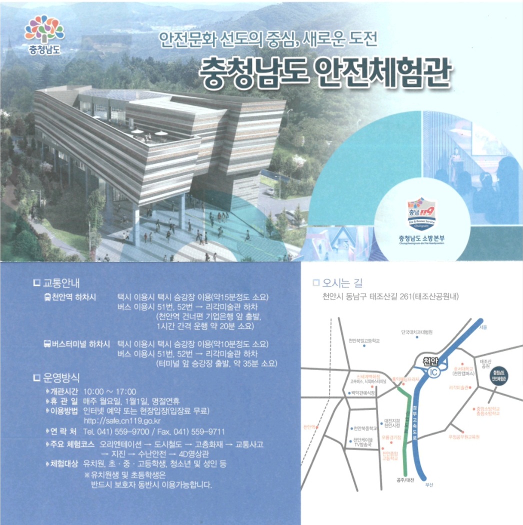 관람시간 09:30 ~ 17:00 (휴관일제) 입장마감 체험 시작 후 10분이내 입장가능 휴관일 매주 월요일 신정, 명절(설날, 추석) 연휴 예약 안내 충청남도 안전체험관은 인터넷 사전 예약제로 운영되고 있�