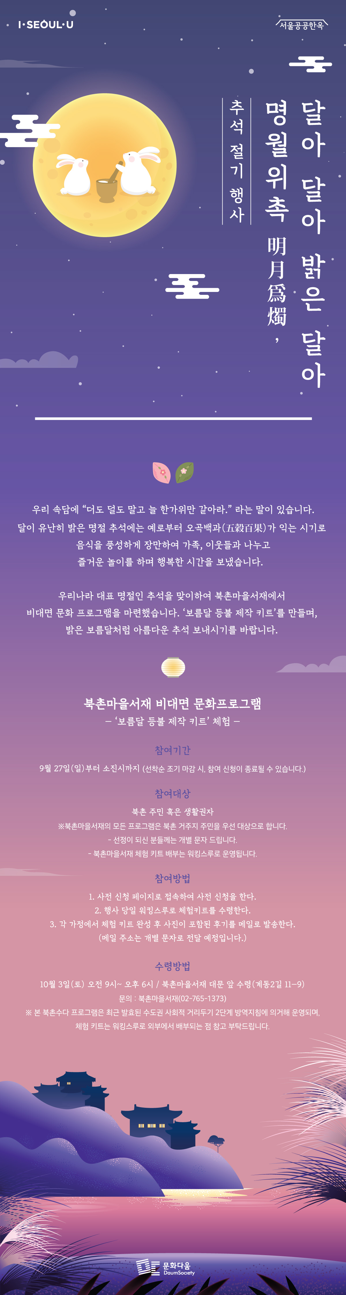 안녕하세요. 북촌마을서재입니다. 북촌마을서재에서 10월 추석 행사를 진행합니다. 다만, 북촌마을서재가 현재 '코로나19' 예방을 위해 임시휴관중인 관계로, 모든 프로그램은 비대면 문화 프로�