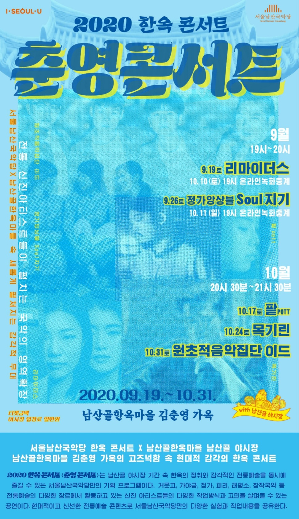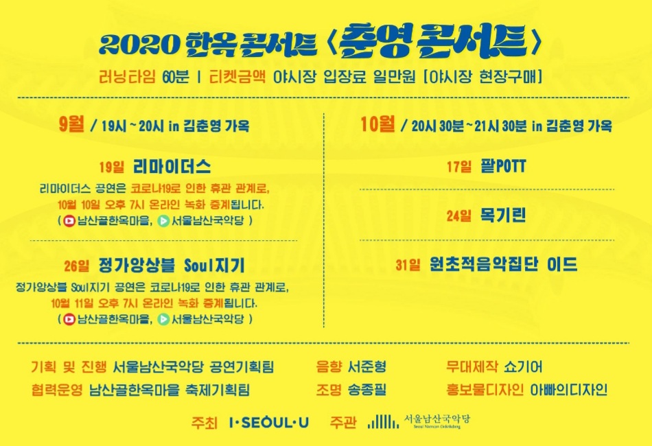 ※ 사회적 거리두기 단계 격상으로 인하여 일부 공연이 온라인 녹화중계로 전환될 수 있습니다. (유튜브 "남산골한옥마을", 네이버TV "서울남산국악당" 채널에서 녹화중계)
