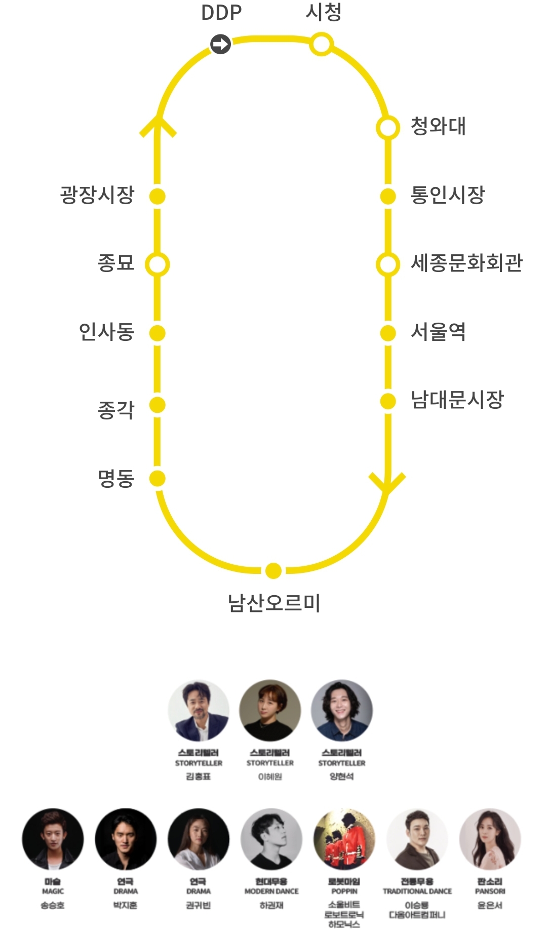 DDP에서 출발하여 시청, 청와대, 세종문화회관 등을 지나 종묘를 거쳐 다시 DDP로 돌아오는 동안 60년대 버스의 상징인 여차장과 시간여행자가 함께 여행하며, 그 시절 예술과 문화 그리고 우리가 기억해야 할 이야기들이 공연으로 펼쳐집니다.